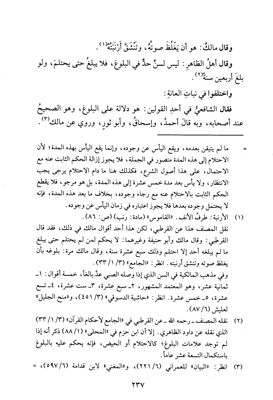 (¬2) نقله المصنف -رحمه الله- عن القرطبي في "الجامع لأحكام القرآن" (3/ 1/ 33) الذي نقله عن داود الظاهري. إلا أن ابن حزم في "المحلى" (1/ 88) ذكر أنه إذا لم توجد علامات البلوغ، كالاحتلام أو الحيض، فإنه يحكم عليه بالبلوغ باستكمال التسعة عشر عامًا.