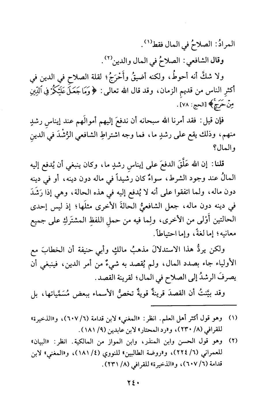ولكن يردُّ هذا الاستدلالَ مذهبُ مالكٍ وأبي حنيفة أن الخطابَ مع الأولياء جاء بصدد المال، ولم يُقصد به شيءٌ بلا من أمر الدين، فينبغي أن يصرفَ الرشدُ إلى الصلاح في المال؛ لقرينة القصد.