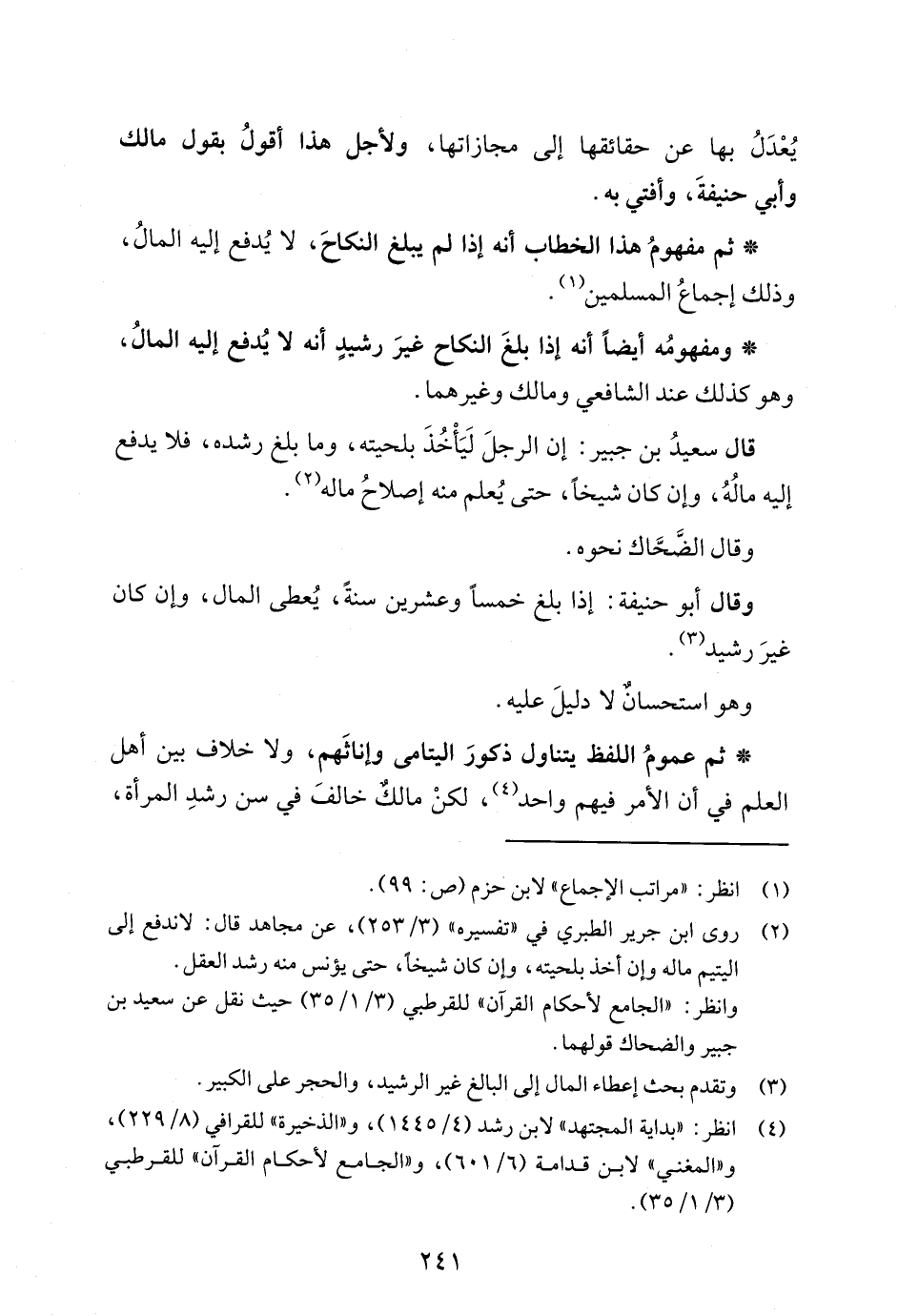 (¬2) روى ابن جرير الطبري في "تفسيره" (3/ 253)، عن مجاهد قال: لاندفع إلى اليتيم ماله وإن أخذ بلحيته، وإن كان شيخًا، حتى يؤنس منه رشد العقل.