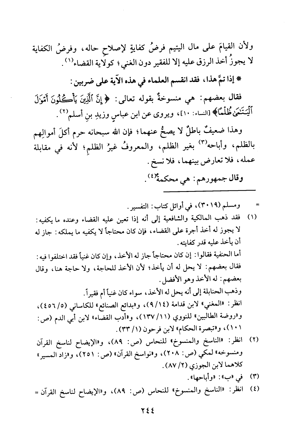 فقال بعضهم: هي منسوخةٌ بقوله تعالى: {إِنَّ الَّذِينَ يَأْكُلُونَ أَمْوَالَ الْيَتَامَى ظُلْمًا} [النساء: 10]، ويروى عن ابن عباسٍ وزيدِ بنِ أسلم (¬2).