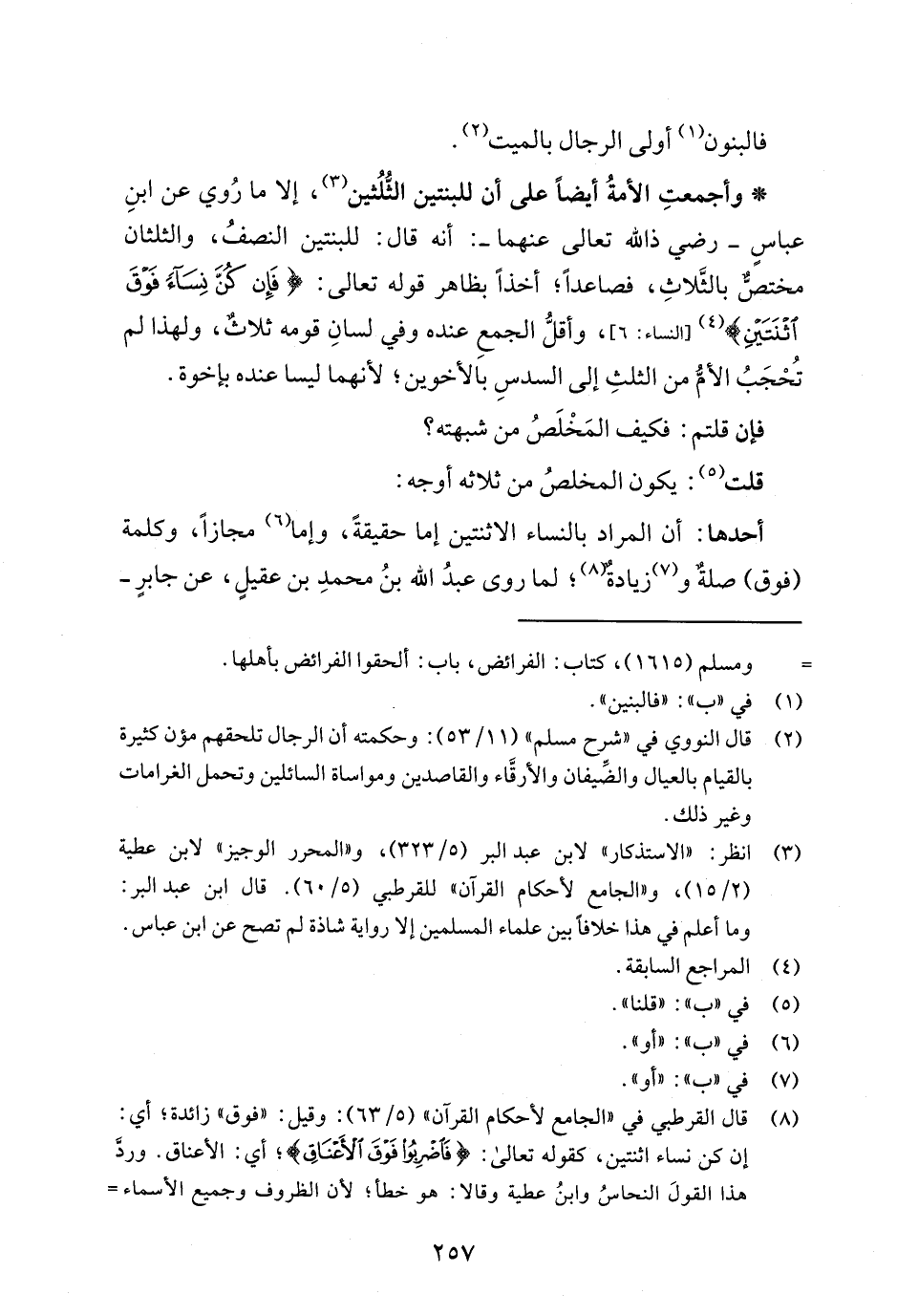 (¬3) انظر: "الاستذكار" لابن عبد البر (5/ 323)، و"المحرر الوجيز" لابن عطية (2/ 15)، و"الجامع لأحكام القرآن" للقرطبي (5/ 60). قال ابن عبد البر: وما أعلم في هذا خلاف بين علماء المسلمين إلا رواية شاذة لم تصح عن ابن عباس.