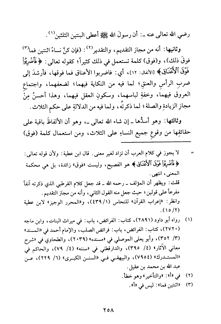 وثانيها: أنه من مجاز التقديم، والتقدير (¬2): (فإن كنَّ نساءً اثنتين فما (¬3) فوقَ ذلك)، و (فوق) كلمة تستعمل في ذلك كثيرًا؛ كقوله تعالى: {فَاضْرِبُوا فَوْقَ الْأَعْنَاقِ} [الأنفال: 12]، أي: فاضربوا الأعناق فما فوقها، فأرشدَ إلى ضربِ الرأسِ والعنقِ؛ لما فيه من النكاية فيهما؛ لضعفهما، واجتماعِ العروق فيهما، وخفةِ لباسهما، وسكونِ العقل فيهما، وهذا أحسنُ مِنْ مجازِ الزيادةِ والصلة؛ لما ذكرتُه، ولما فيه من الدلالةِ على حكمِ الثلاث.