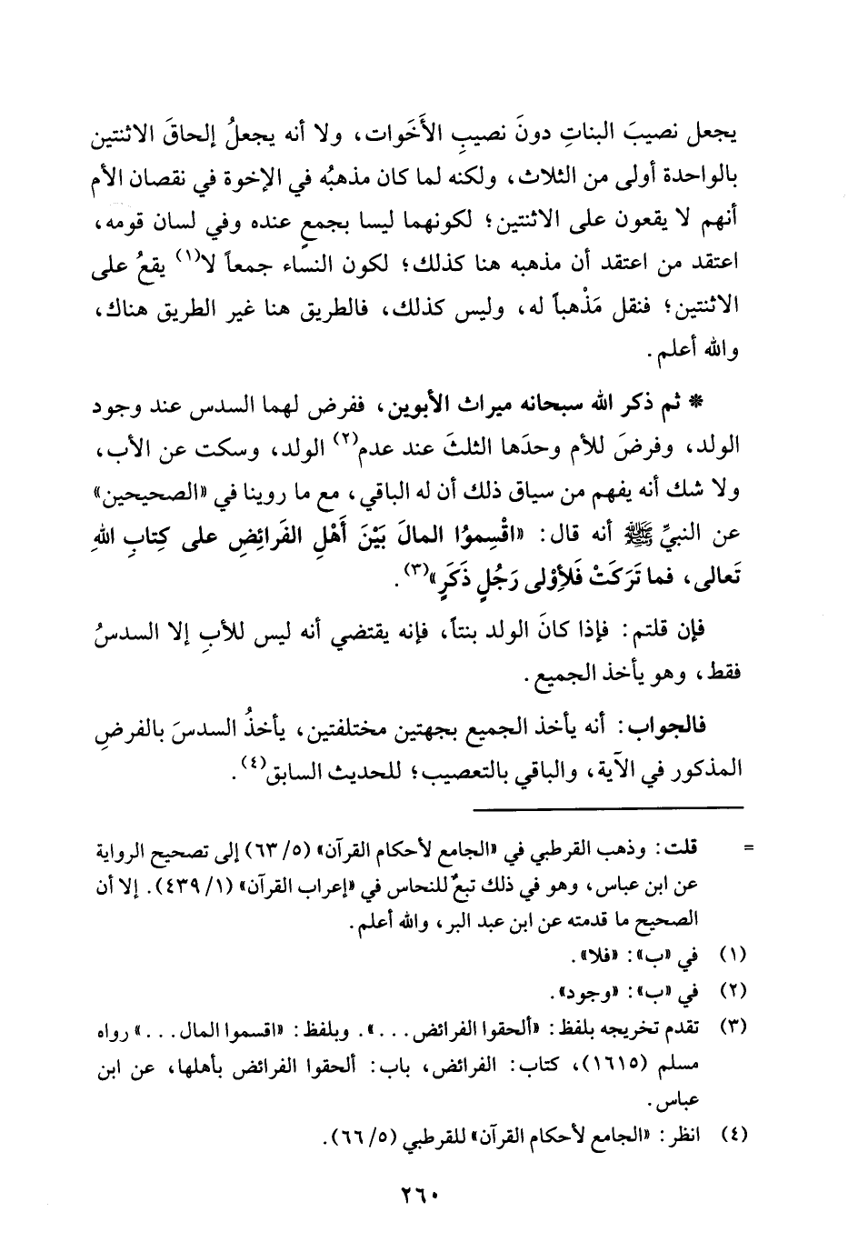 * ثم ذكر الله سبحانه ميراث الأبوين، ففرض لهما السدس عند وجود الولد، وفرضَ للأم وحدَها الثلثَ عند عدم (¬2) الولد، وسكت عن الأب، ولا شك أنه يفهم من سياق ذلك أن له الباقي، مع ما روينا في "الصحيحين" عن النبيِّ -صلى الله عليه وسلم- أنه قال: "اقْسِموُا المالَ بَيْنَ أَهْلِ الفَرائِضِ على كتابِ اللهِ تَعالى، فما تَرَكَتْ فَلأِوْلى رَجُلٍ ذَكَرٍ" (¬3).