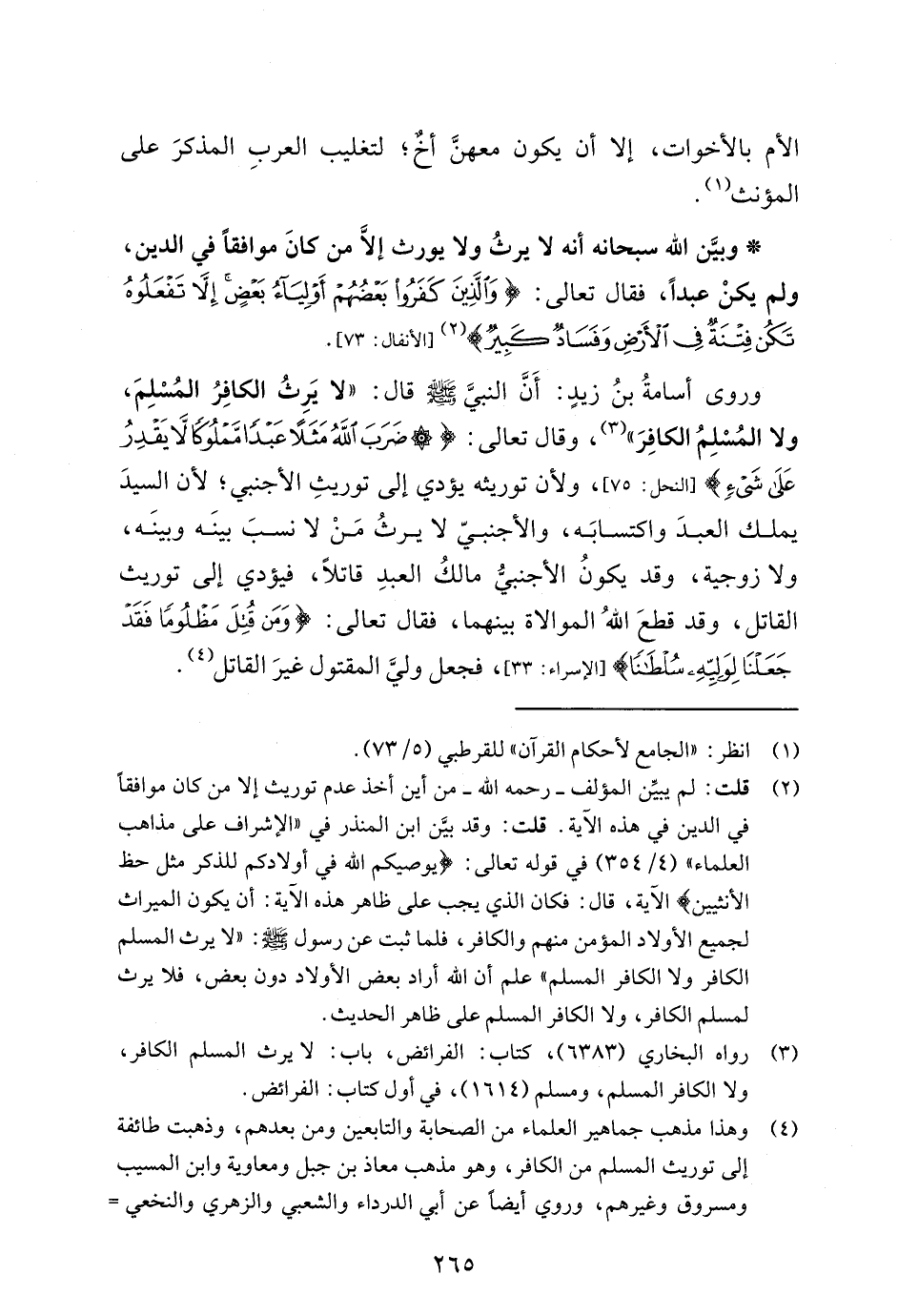 * وبيَّن الله سبحانه أنه لا يرثُ ولا يورث إلَّا من كانَ موافقًا في الدين، ولم يكنْ عبدًا، فقال تعالى: {وَالَّذِينَ كَفَرُوا بَعْضُهُمْ أَوْلِيَاءُ بَعْضٍ إِلَّا تَفْعَلُوهُ تَكُنْ فِتْنَةٌ فِي الْأَرْضِ وَفَسَادٌ كَبِيرٌ} (¬2) [الأنفال: 73].