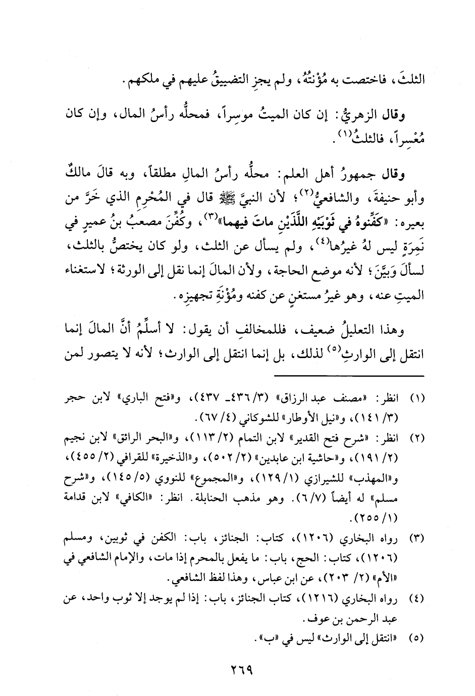 وقال جمهورُ أهل العلم: محلُّه رأسُ المالِ مطلقًا، وبه قَالَ مالكٌ وأبو حنيفةَ، والشافعيُّ (¬2)؛ لأنَّ النبي -صلى الله عليه وسلم- قال في المحُرِمِ الذي خَرَّ من بعيره: "كفِّنوهُ في ثَوْبَيْهِ اللَّذَيْنِ ماتَ فيهما" (¬3)، وكُفِّنَ مصعبُ بنُ عميرٍ في نَمِرَة ليس لهُ غيرُها (¬4)، ولم يسأل عن الثلث، ولو كان يختصُّ بالثلث، لسألَ وَبيَّنَ؛ لأنه موضع الحاجة، ولأن المالَ إنما نقل إلى الورثة؛ لاستغناء الميتِ عنه، وهو غيرُ مستغنٍ عن كفنه ومُؤْنَةِ تجهيزِه.