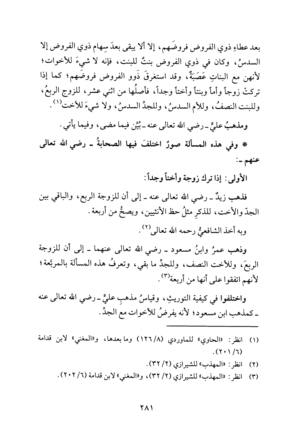 واختلفوا في كيفية التوريثِ، وقياسُ مذهبِ عليٍّ -رضي الله تعالى عنه- كمذهب ابن مسعود؛ لأنه يفرضُ للأخوات مع الجدِّ.