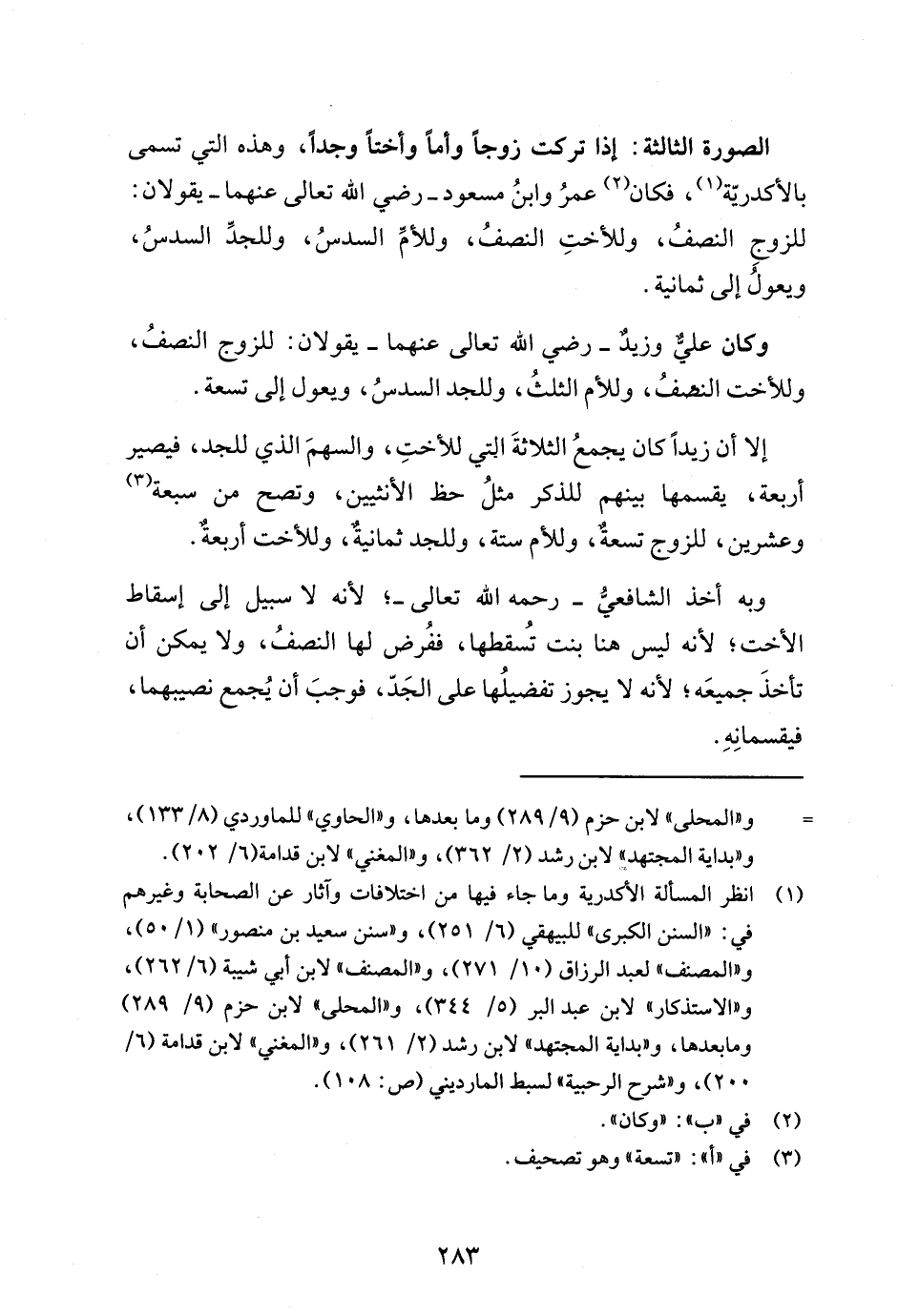 (¬1) انظر المسألة الأكدرية وما جاء فيها من اختلافات وآثار عن الصحابة وغيرهم في: "السنن الكبرى" للبيهقي (6/ 251)، و "سنن سعيد بن منصور" (1/ 50)، و"المصنف" لعبد الرزاق (10/ 271)، و "المصنف" لابن أبي شيبة (6/ 262)، و"الاستذكار" لابن عبد البر (5/ 344)، و"المحلى" لابن حزم (9/ 289) وما بعدها، و "بداية المجتهد" لابن رشد (2/ 261)، و"المغني" لابن قدامة (6/ 200)، و"شرح الرحبية" لسبط المارديني (ص: 108).