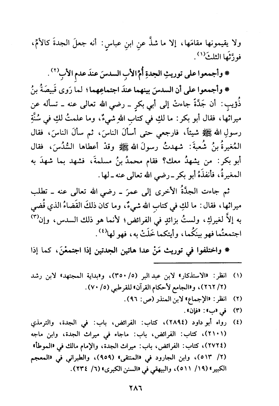 (¬4) رواه أبو داود (2894)، كتاب: الفرائض، باب: في الجدة، والترمذي (2101)، كتاب: الفرائض، باب: ما جاء في ميراث الجدة، وابن ماجه (2724)، كتاب: الفرائض، باب: ميراث الجدة، والإمام مالك في "الموطأ" (2/ 513)، وابن الجارود في "المنتقى" (959)، والطبراني في "المعجم الكبير" (19/ 511)، والبيهقي في "السنن الكبرى" (6/ 234).