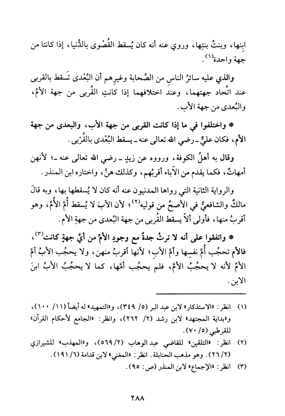 والذي عليه سائرُ الناسِ من الصَّحابة وغيرِهم أن البُعْدى تَسقط بالقربى عند اتِّحاد جهتهما، وعند اختلافهما إذا كانتِ القُربى من جهة الأمِّ، والبُعدى من جهة الأب.