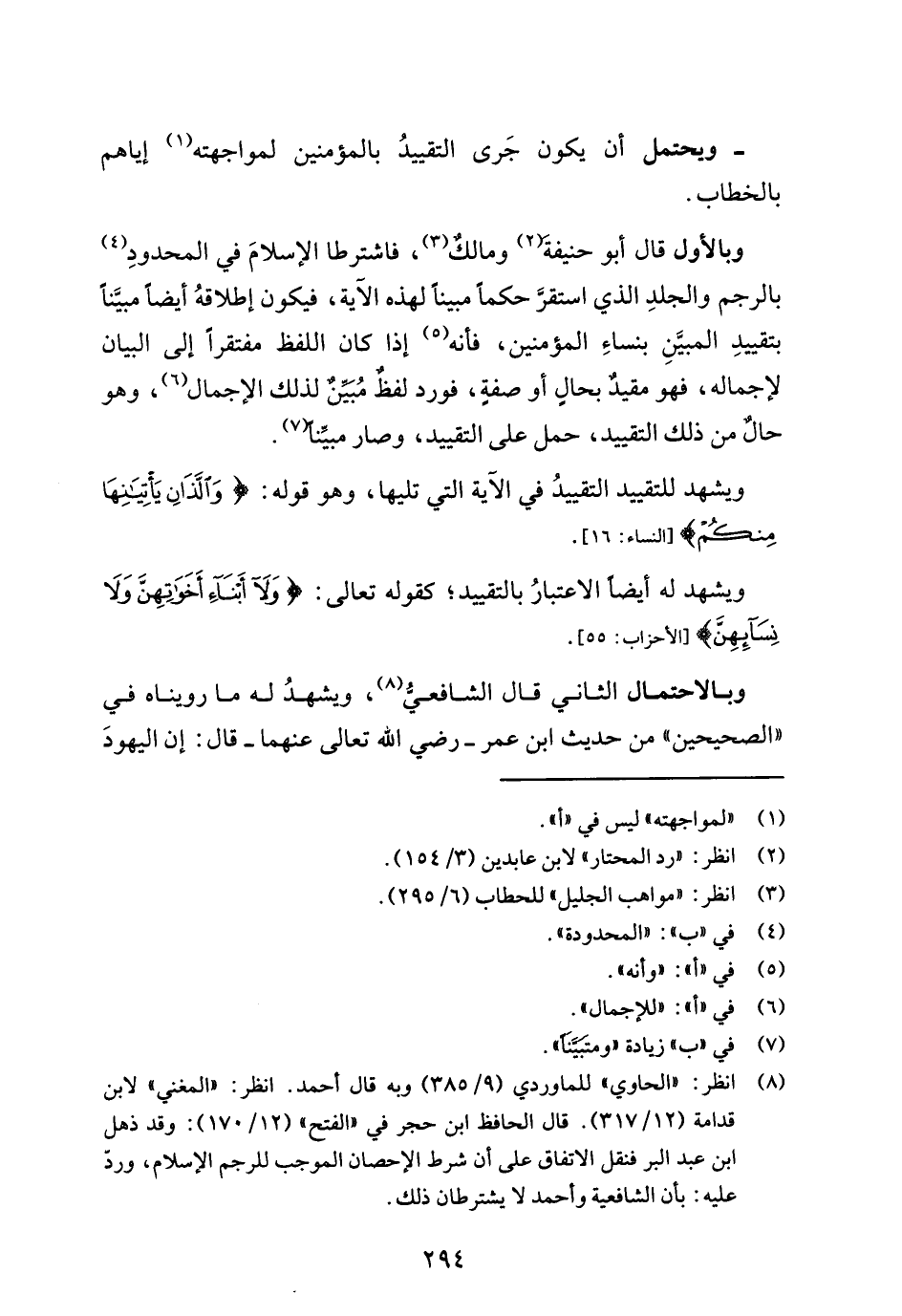 وبالأول قال أبو حنيفةَ (¬2) ومالكٌ (¬3)، فاشترطا الإِسلامَ في المحدودِ (¬4) بالرجم والجلدِ الذي استقر حكمًا مبينًا لهذه الآية، فيكون إطلاقهُ أيضًا مبيَّنًا بتقييدِ المبيَّنِ بنساءِ المؤمنين، فأنه (¬5) إذا كان اللفظ مفتقرًا إلى البيان لإجماله، فهو مقيدٌ بحالٍ أو صفةٍ، فورد لفظٌ مُبَيِّنٌ لذلك الإجمال (¬6)، وهو حالٌ من ذلك التقييد، حمل على التقييد، وصار مبيِّناً (¬7).