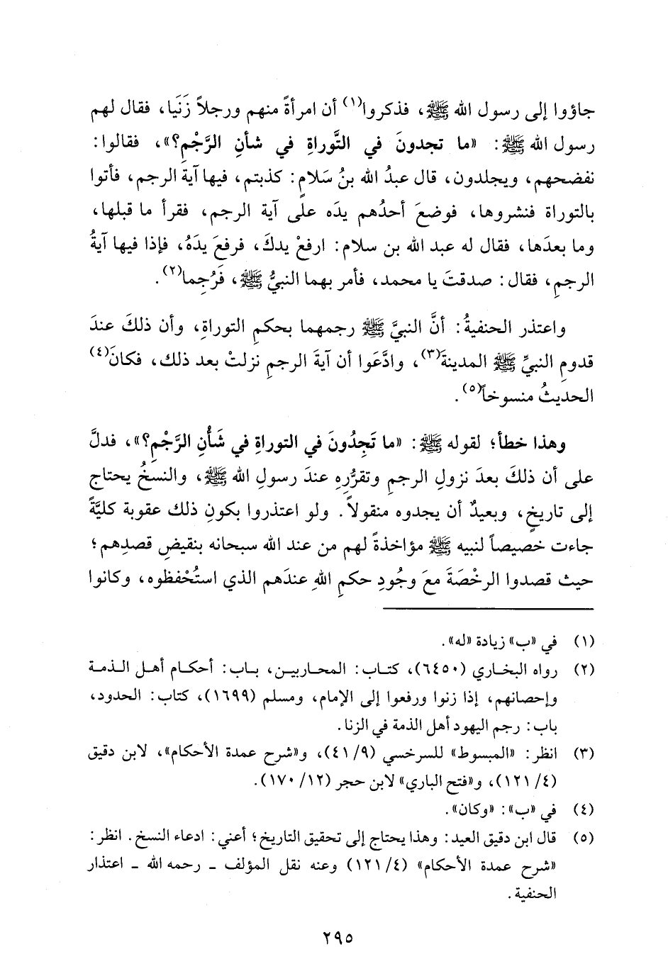 واعتذر الحنفيةُ: أنَّ النبي -صلى الله عليه وسلم- رجمهما بحكمِ التوراةِ، وأن ذلكَ عندَ قدومِ النبيِّ -صلى الله عليه وسلم- المدينةَ (¬3)، وادَّعَوا أن آيةَ الرجمِ نزلتْ بعد ذلك، فكانَ (¬4) الحديثُ منسوخاً (¬5).