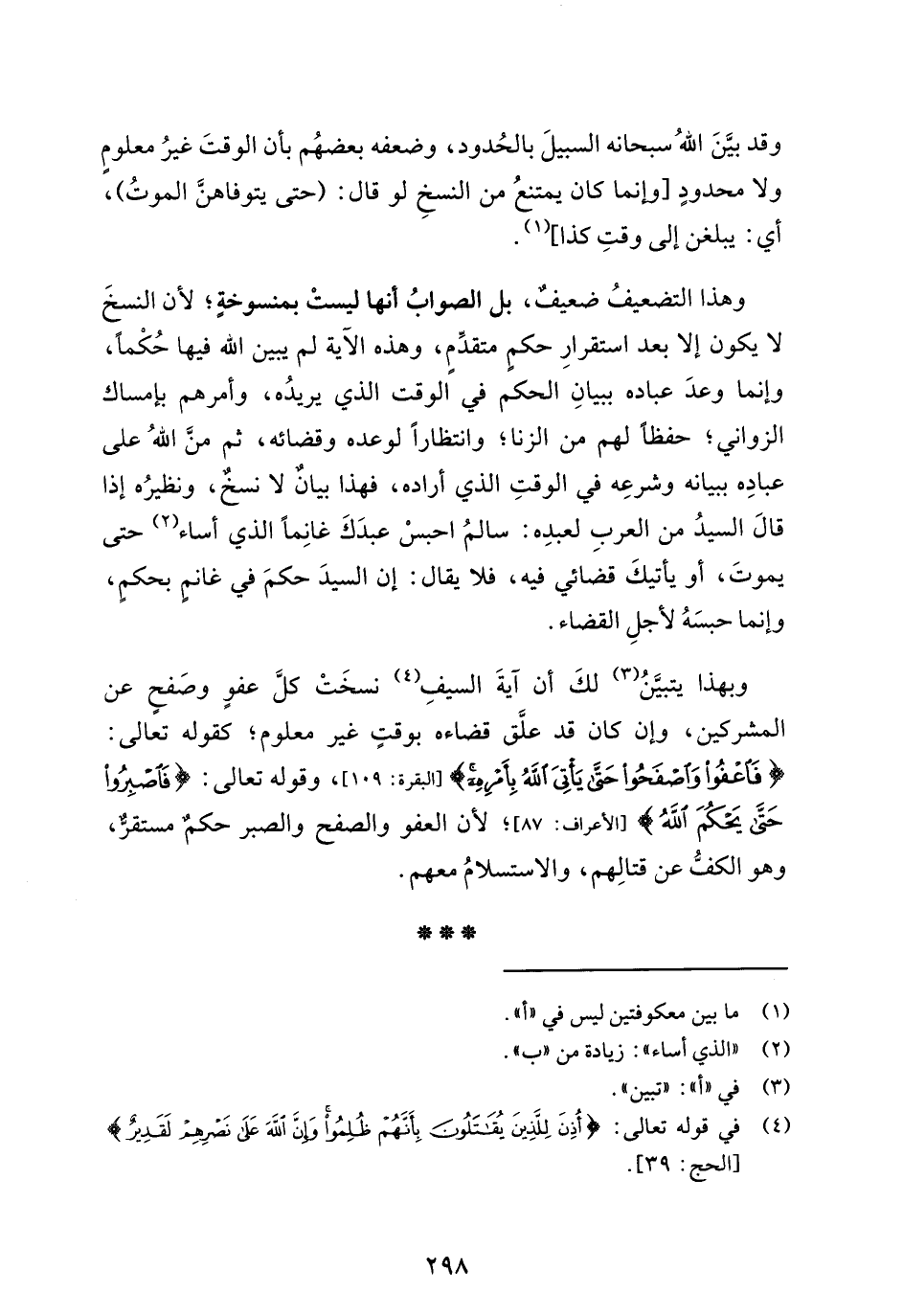 وبهذا يتبيَّنُ (¬3) لكَ أن آيةَ السيفِ (¬4) نسخَتْ كلَّ عفوٍ وصَفحٍ عن المشركين، وإن كان قد علَّق قضاءه بوقتٍ غير معلوم؛ كقوله تعالى: {فَاعْفُوا وَاصْفَحُوا حَتَّى يَأْتِيَ اللَّهُ بِأَمْرِهِ} [البقرة: 109]، وقوله تعالى: {فَاصْبِرُوا حَتَّى يَحْكُمَ اللَّهُ} [الأعراف: 87]؛ لأن العفو والصفح والصبر حكمٌ مستقرٌّ، وهو الكفُّ عن قتالِهم، والاستسلامُ معهم.