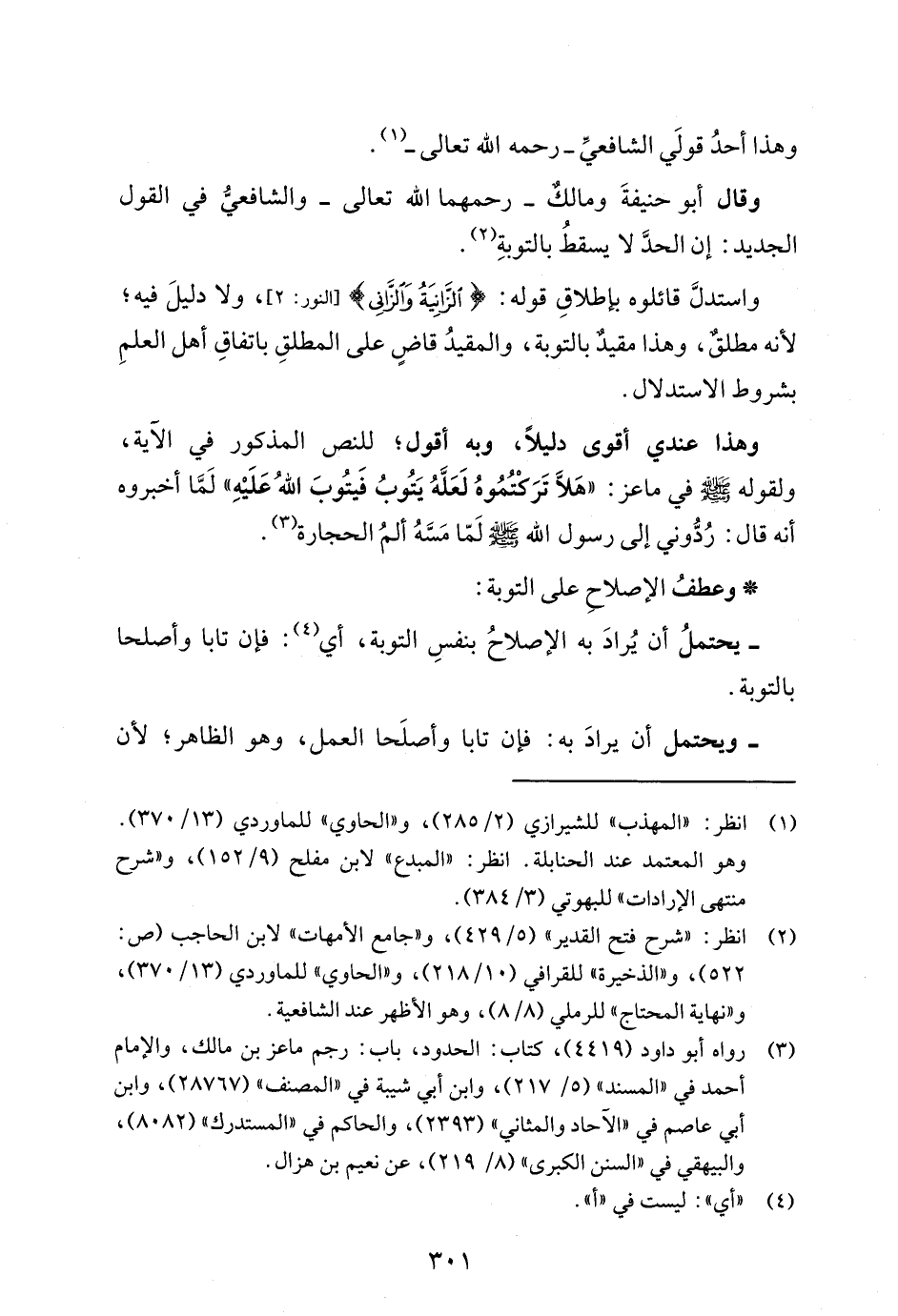 وقال أبو حنيفةَ ومالكٌ -رحمهما الله تعالى- والشافعيُّ في القول الجديد: إن الحدَّ لا يسقطُ بالتوبةِ (¬2).