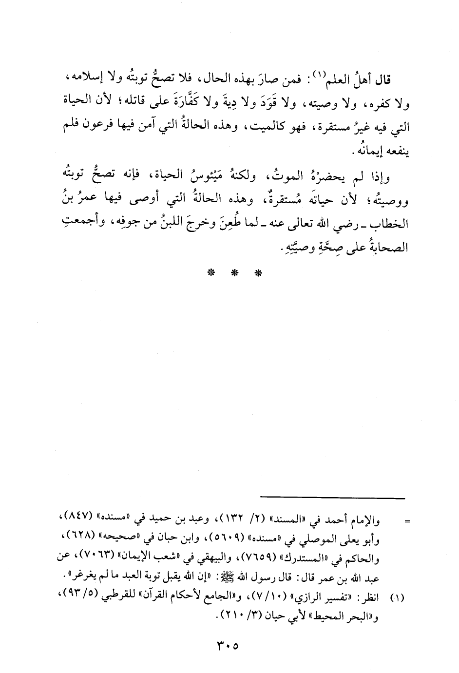 قال أهلُ العلم (¬1): فمن صارَ بهذه الحال، فلا تصحُّ توبتُه ولا إسلامه، ولا كفره، ولا وصيته، ولا قَوَدَ ولا دِيةَ ولا كَفَّارَةَ على قاتله؛ لأن الحياة التي فيه غيرُ مستقرة، فهو كالميت، وهذه الحالةُ التي آمن فيها فرعون فلم ينفعه إيمانُه.