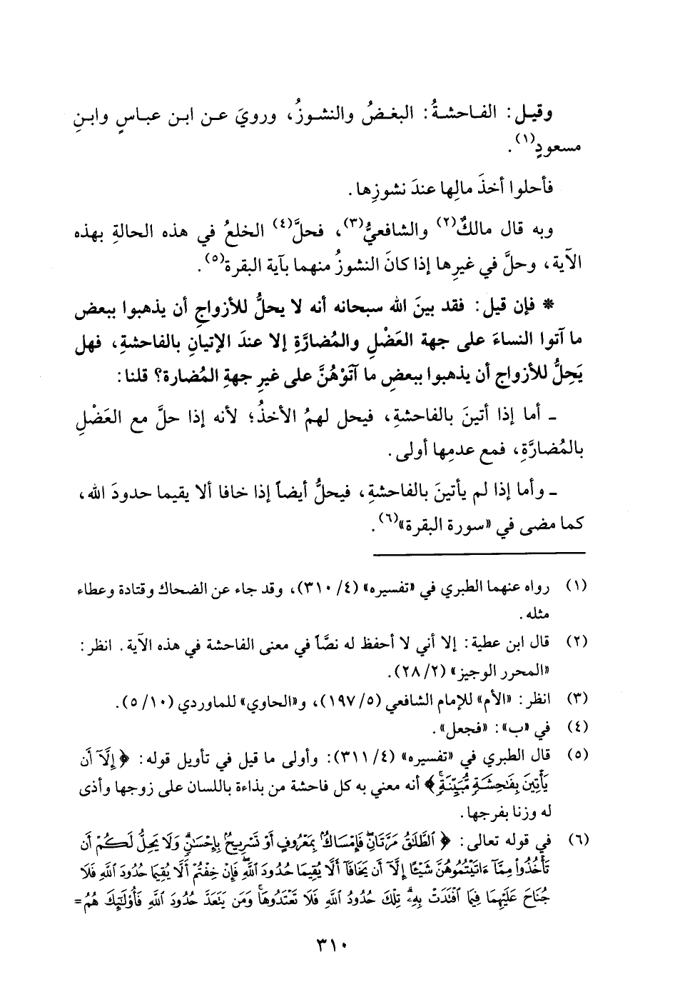 (¬5) قال الطبري في "تفسيره" (4/ 311): وأولى ما قيل في تأويل قوله: {إِلَّا أَنْ يَأْتِينَ بِفَاحِشَةٍ مُبَيِّنَةٍ} أنه معني به كل فاحشة من بذاءة باللسان على زوجها وأذى له وزنا بفرجها.