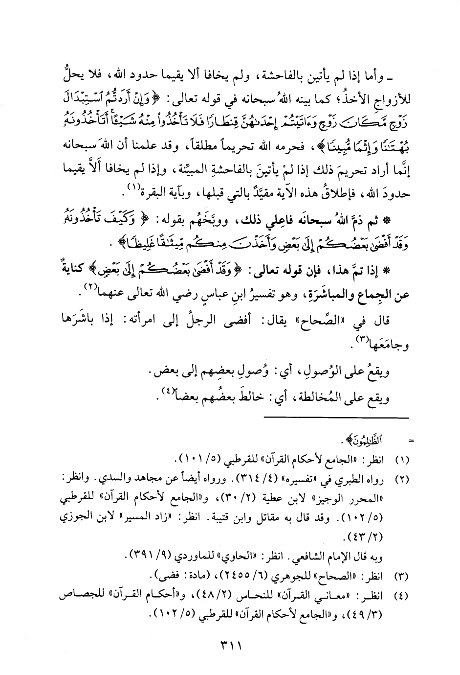 " ثم ذمَّ اللهُ سبحانَه فاعِلي ذلك، ووبَّخَهُم بقوله: {وَكَيْفَ تَأْخُذُونَهُ وَقَدْ أَفْضَى بَعْضُكُمْ إِلَى بَعْضٍ وَأَخَذْنَ مِنْكُمْ مِيثَاقًا غَلِيظًا}.