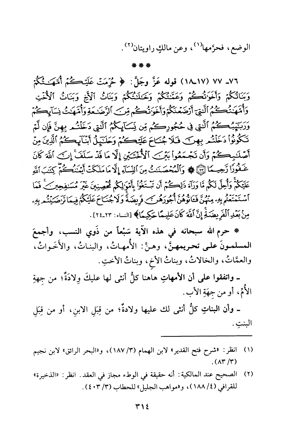 76 - 77 (17 - 18) قوله عَزَّ وجَلَّ: {حُرِّمَتْ عَلَيْكُمْ أُمَّهَاتُكُمْ وَبَنَاتُكُمْ وَأَخَوَاتُكُمْ وَعَمَّاتُكُمْ وَخَالَاتُكُمْ وَبَنَاتُ الْأَخِ وَبَنَاتُ الْأُخْتِ وَأُمَّهَاتُكُمُ اللَّاتِي أَرْضَعْنَكُمْ وَأَخَوَاتُكُمْ مِنَ الرَّضَاعَةِ وَأُمَّهَاتُ نِسَائِكُمْ وَرَبَائِبُكُمُ اللَّاتِي فِي حُجُورِكُمْ مِنْ نِسَائِكُمُ اللَّاتِي دَخَلْتُمْ بِهِنَّ فَإِنْ لَمْ تَكُونُوا دَخَلْتُمْ بِهِنَّ فَلَا جُنَاحَ عَلَيْكُمْ وَحَلَائِلُ أَبْنَائِكُمُ الَّذِينَ مِنْ أَصْلَابِكُمْ وَأَنْ تَجْمَعُوا بَيْنَ الْأُخْتَيْنِ إِلَّا مَا قَدْ سَلَفَ إِنَّ اللَّهَ كَانَ غَفُورًا رَحِيمًا (23) وَالْمُحْصَنَاتُ مِنَ النِّسَاءِ إِلَّا مَا مَلَكَتْ أَيْمَانُكُمْ كِتَابَ اللَّهِ عَلَيْكُمْ وَأُحِلَّ لَكُمْ مَا وَرَاءَ ذَلِكُمْ أَنْ تَبْتَغُوا بِأَمْوَالِكُمْ مُحْصِنِينَ غَيْرَ مُسَافِحِينَ فَمَا اسْتَمْتَعْتُمْ بِهِ مِنْهُنَّ فَآتُوهُنَّ أُجُورَهُنَّ فَرِيضَةً وَلَا جُنَاحَ عَلَيْكُمْ فِيمَا تَرَاضَيْتُمْ بِهِ مِنْ بَعْدِ الْفَرِيضَةِ إِنَّ اللَّهَ كَانَ عَلِيمًا حَكِيمًا} [النساء: 23 - 24].