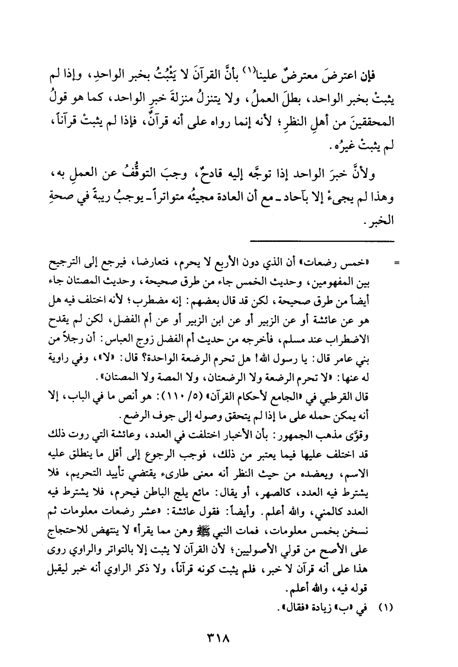 وقوَّى مذهب الجمهور: بأن الأخبار اختلفت في العدد، وعائشة التي روت ذلك قد اختلف عليها فيما يعتبر من ذلك، فوجب الرجوع إلى أقل ما ينطلق عليه الاسم، ويعضده من حيث النظر أنه معنى طارئ يقتضي تأييد التحريم، فلا يشترط فيه العدد، كالصهر، أو يقال: مائع يلج الباطن فيحرم، فلا يشترط فيه العدد كالمني، والله أعلم. وأيضًا: فقول عائشة: "عشر رضعات معلومات ثم نسخن بخمس معلومات، فمات النبي - صلى الله عليه وسلم - وهن مما يقرأ" لا ينتهض للاحتجاج على الأصح من قولي الأصوليين؛ لأن القرآن لا يثبت إلا بالتواتر والراوي روى هذا على أنه قرآن لا خبر، فلم يثبت كونه قرآنًا، ولا ذكر الراوي أنه خبر ليقبل قوله فيه، والله أعلم.