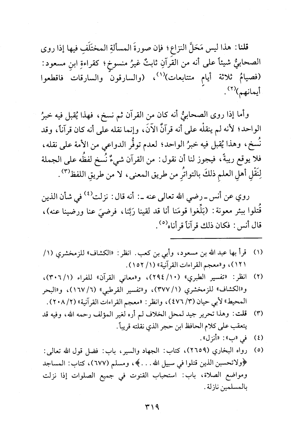 وأما إذا روى الصحابيُّ أنه كان من القرآن ثم نسخ، فهذا يُقبل فيه خبرُ الواحد؛ لأنه لم ينقلْه على أنه قرآنٌ الآنَ، وإنما نقله على أنه كان قرآنًا، وقد نُسخ، وهذا يُقبل فيه خبرُ الواحد؛ لعدم توفُّر الدواعي من الأمة على نقله، فلا يوقع ريبةً، فيجوز لنا أن نقول: من القرآن شيءٌ نُسخ لفظُه على الجملة لِنَقْلِ أهلِ العلمِ ذلكَ بالتواتُرِ من طريق المعنى، لا من طريقِ اللفظ (¬3).