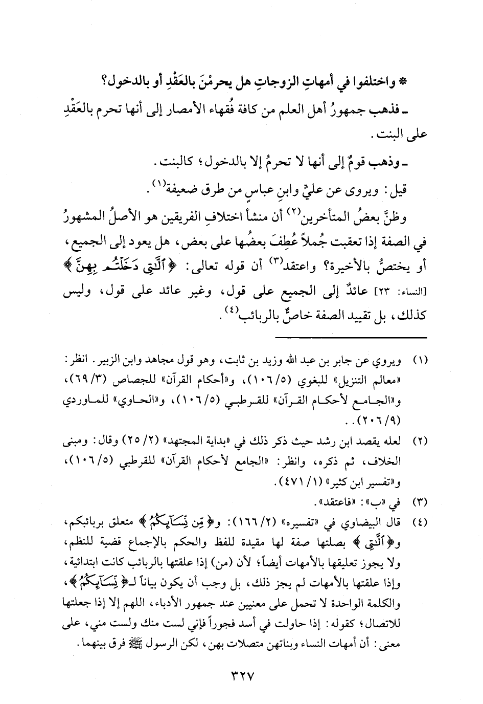 وظنَّ بعضُ المتأخرين (¬2) أن منشأ اختلافِ الفريقين هو الأصلُ المشهورُ في الصفة إذا تعقبت جُملًا عُطِفَ بعضُها على بعض، هل يعود إلى الجميع، أو يختصُّ بالأخيرة؟ واعتقد (¬3) أن قوله تعالى: {اللَّاتِي دَخَلْتُمْ بِهِنَّ} [النساء: 23] عائدٌ إلى الجميع على قول، وغير عائد على قول، وليس كذلك، بل تقييد الصفة خاصٌّ بالربائب (¬4).
