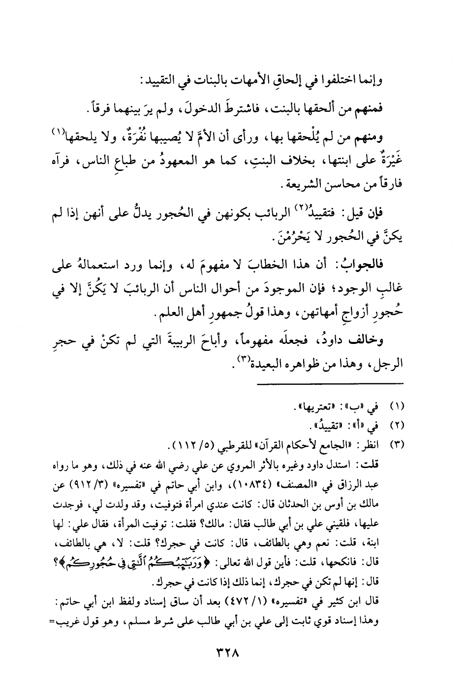 قلت: استدل داود وغيره بالأثر المروي عن علي رضي الله عنه في ذلك، وهو ما رواه عبد الرزاق في "المصنف" (10834)، وابن أبي حاتم في "تفسيره" (3/ 912) عن مالك بن أوس بن الحدثان قال: كانت عندي امرأة فتوفيت، وفد ولدت لي، فوجدت عليها، فلقيني علي بن أبي طالب فقال: مالك؟ فقلت: توفيت المرأة، فقال علي: لها ابنة، قلت: نعم وهي بالطائف، قال: كانت في حجرك؟ قلت: لا، هي بالطائف، قال: فانكحها، قلت: فأين قول الله تعالى: {وَرَبَائِبُكُمُ اللَّاتِي فِي حُجُورِكُمْ}؟ قال: إنها لم تكن في حجرك، إنما ذلك إذا كانت في حجرك.