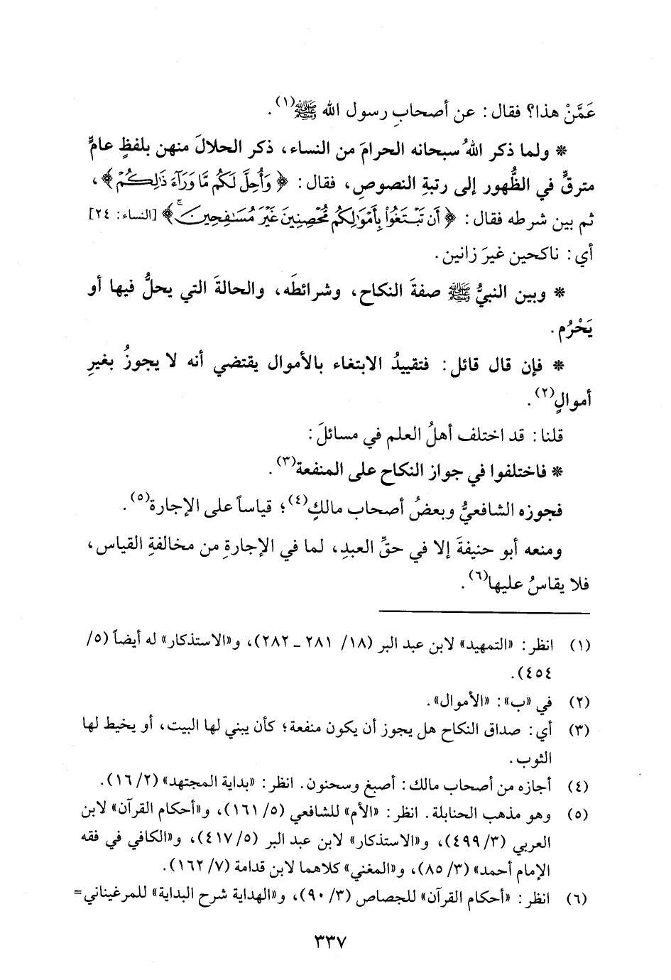 " ولما ذكر اللهُ سبحانه الحرامَ من النساء، ذكر الحلالَ منهن بلفظٍ عامٍّ مترقٍّ في الظُّهور إلى رتبةِ النصوصِ، فقال: {وَأُحِلَّ لَكُمْ مَا وَرَاءَ ذَلِكُمْ}، ثم بين شرطه فقال: {أَنْ تَبْتَغُوا بِأَمْوَالِكُمْ مُحْصِنِينَ غَيْرَ مُسَافِحِينَ} [النساء: 24] أي: ناكحين غيرَ زانين.
