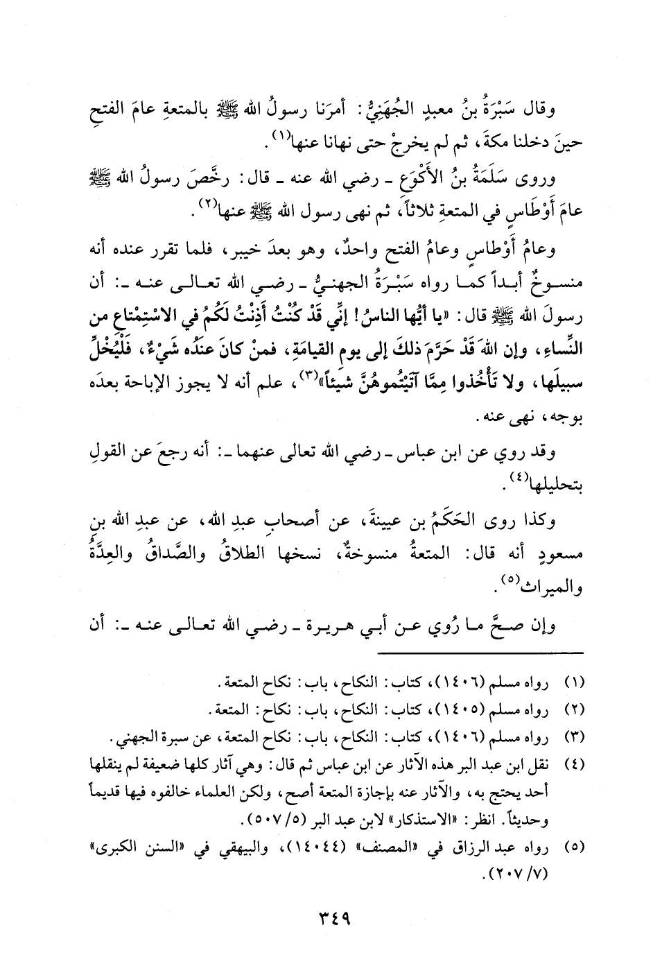 (¬4) نقل ابن عبد البر هذه الآثار عن ابن عباس ثم قال: وهي آثار كلها ضعيفة لم ينقلها أحد يحتج به، والآثار عنه بإجازة المتعة أصح، ولكن العلماء خالفوه فيها قديمًا وحديثًا. انظر: "الاستذكار" لابن عبد البر (5/ 507).