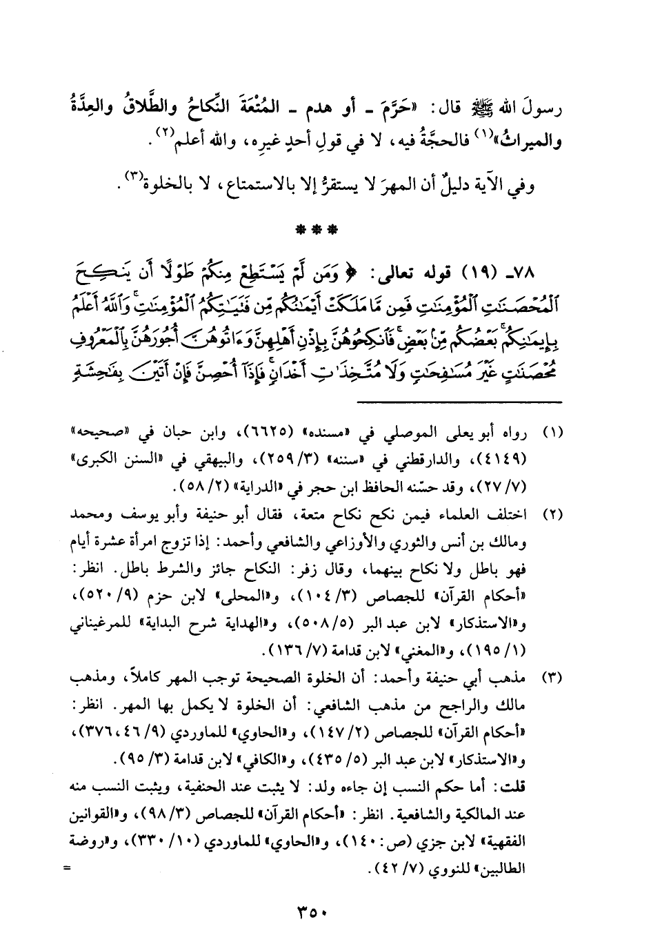 78 - (19) قوله تعالى: {وَمَنْ لَمْ يَسْتَطِعْ مِنْكُمْ طَوْلًا أَنْ يَنْكِحَ الْمُحْصَنَاتِ الْمُؤْمِنَاتِ فَمِنْ مَا مَلَكَتْ أَيْمَانُكُمْ مِنْ فَتَيَاتِكُمُ الْمُؤْمِنَاتِ وَاللَّهُ أَعْلَمُ بِإِيمَانِكُمْ بَعْضُكُمْ مِنْ بَعْضٍ فَانْكِحُوهُنَّ بِإِذْنِ أَهْلِهِنَّ وَآتُوهُنَّ أُجُورَهُنَّ بِالْمَعْرُوفِ مُحْصَنَاتٍ غَيْرَ مُسَافِحَاتٍ وَلَا مُتَّخِذَاتِ أَخْدَانٍ فَإِذَا أُحْصِنَّ فَإِنْ أَتَيْنَ بِفَاحِشَةٍ
