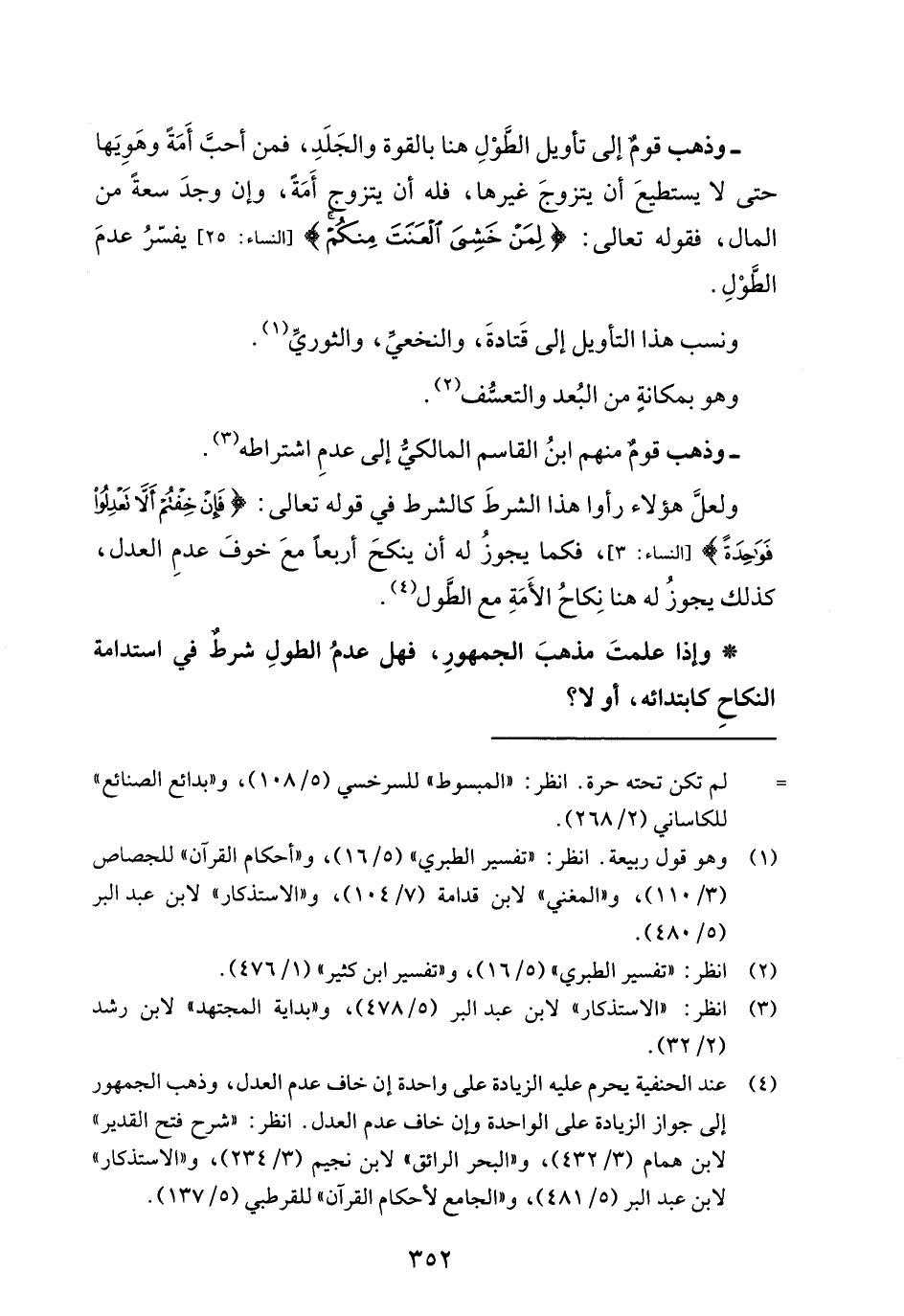 ولعلَّ هؤلاء رأوا هذا الشرطَ كالشرط في قوله تعالى: {فَإِنْ خِفْتُمْ أَلَّا تَعْدِلُوا فَوَاحِدَةً} [النساء: 3]، فكما يجوزُ له أن ينكحَ أربعاً معَ خوفَ عدمِ العدل، كذلك يجوزُ له هنا نِكاحُ الأَمَةِ مع الطَّول (¬4).