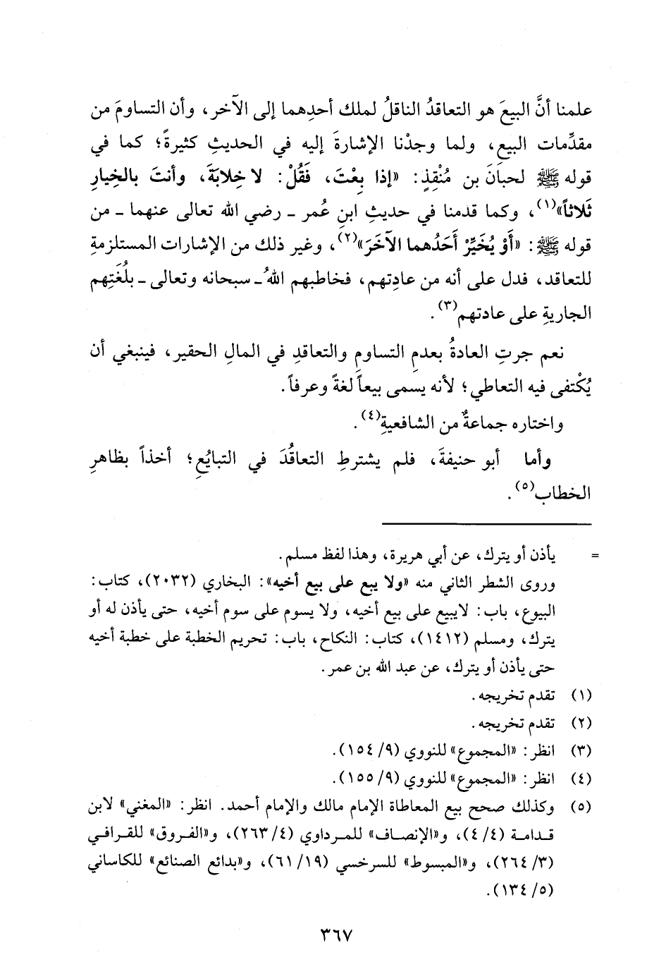 علمنا أنَّ البيعَ هو التعاقدُ الناقلُ لملك أحدِهما إلى الآخر، وأن التساومَ من مقدِّمات البيعِ، ولما وجدْنا الإشارةَ إليه في الحديثِ كثيرةً؛ كما في قوله - صلى الله عليه وسلم - لحبانَ بن مُنْقِذٍ: "إذا بِعْتَ، فَقُلْ: لا خِلابَةَ، وأنتَ بالخِيارِ ثَلاثاً" (¬1)، وكما قدمنا في حديثِ ابنِ عُمر -رضي الله تعالى عنهما- من قوله - صلى الله عليه وسلم -: "أَوْ يُخَيِّرْ أَحَدُهما الآخَرَ" (¬2)، وغير ذلك من الإشارات المستلزمةِ للتعاقد، فدل على أنه من عادِتهم، فخاطبهم اللهُ -سبحانه وتعالى- بلُغَتِهم الجاريةِ على عادتهم (¬3).