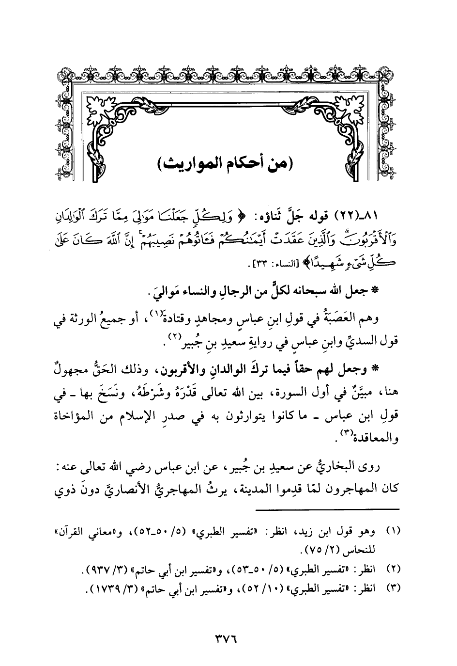 81 - (22) قولهم جَلَّ ثناؤه: {وَلِكُلٍّ جَعَلْنَا مَوَالِيَ مِمَّا تَرَكَ الْوَالِدَانِ وَالْأَقْرَبُونَ وَالَّذِينَ عَقَدَتْ أَيْمَانُكُمْ فَآتُوهُمْ نَصِيبَهُمْ إِنَّ اللَّهَ كَانَ عَلَى كُلِّ شَيْءٍ شَهِيدًا} [النساء: 33].
