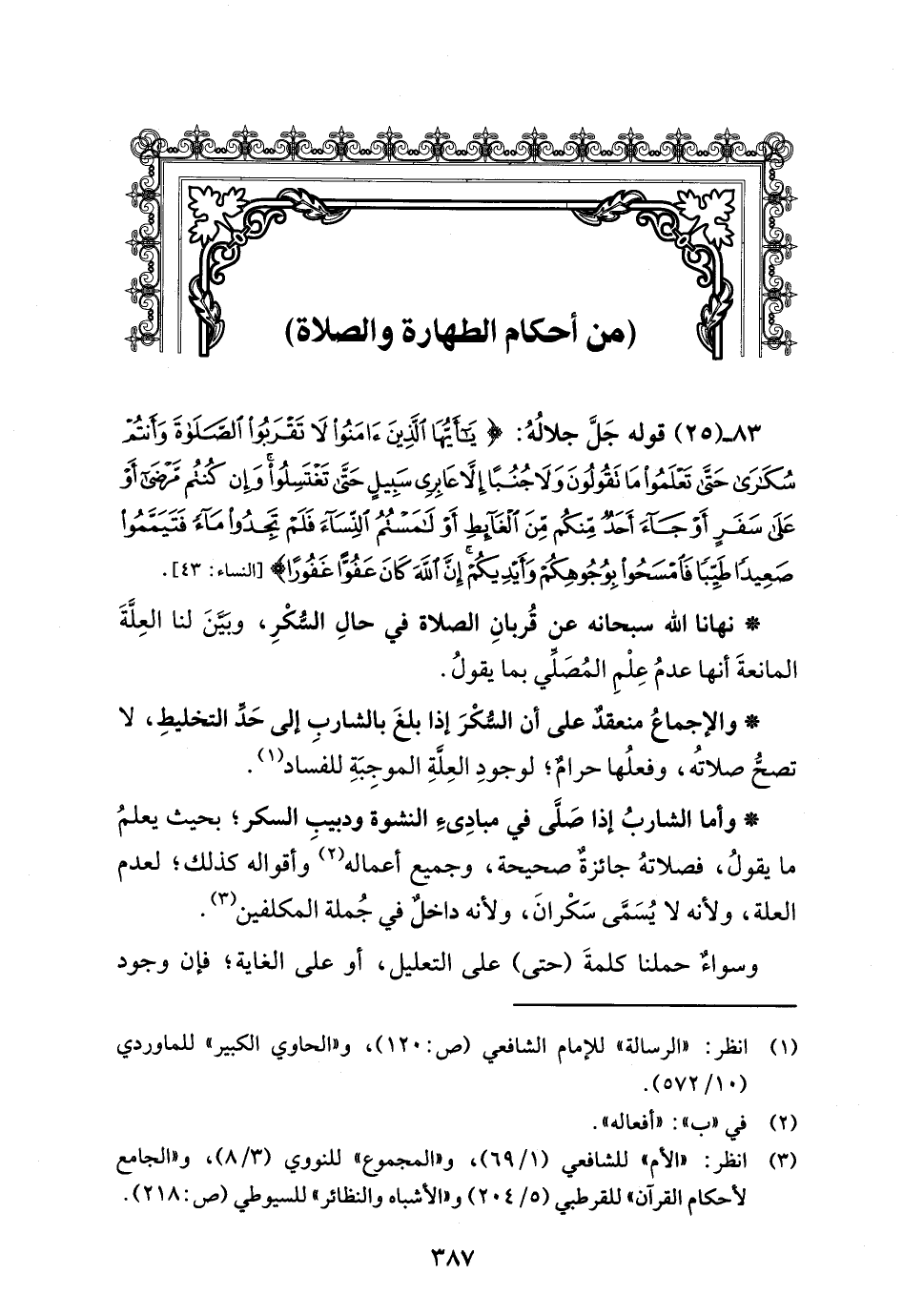 83 - (25) قوله جَلَّ جلالُهُ: {يَاأَيُّهَا الَّذِينَ آمَنُوا لَا تَقْرَبُوا الصَّلَاةَ وَأَنْتُمْ سُكَارَى حَتَّى تَعْلَمُوا مَا تَقُولُونَ وَلَا جُنُبًا إِلَّا عَابِرِي سَبِيلٍ حَتَّى تَغْتَسِلُوا وَإِنْ كُنْتُمْ مَرْضَى أَوْ عَلَى سَفَرٍ أَوْ جَاءَ أَحَدٌ مِنْكُمْ مِنَ الْغَائِطِ أَوْ لَامَسْتُمُ النِّسَاءَ فَلَمْ تَجِدُوا مَاءً فَتَيَمَّمُوا صَعِيدًا طَيِّبًا فَامْسَحُوا بِوُجُوهِكُمْ وَأَيْدِيكُمْ إِنَّ اللَّهَ كَانَ عَفُوًّا غَفُورًا} [النساء: 43].
