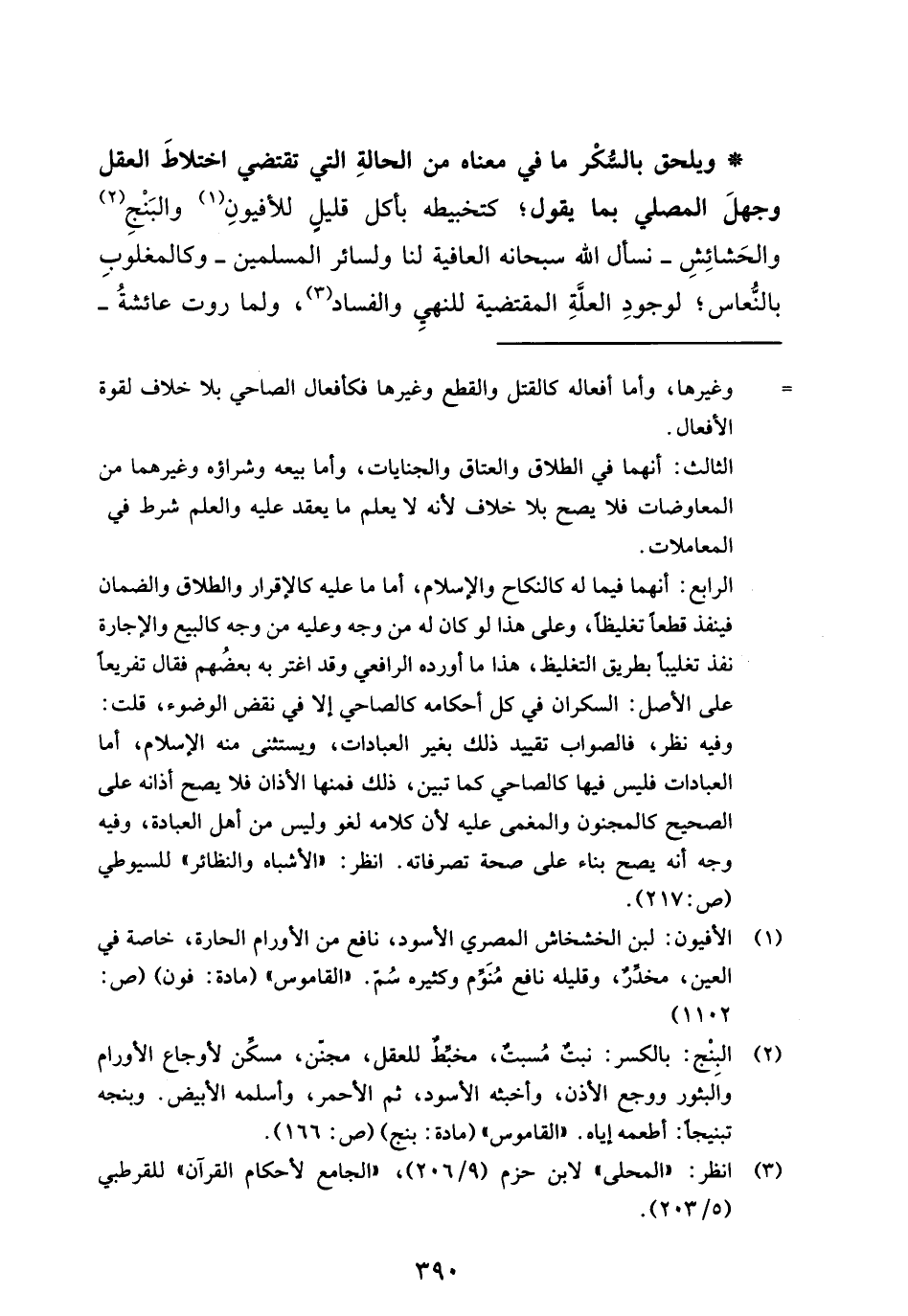 * ويلحق بالسُّكْر ما في معناه من الحالةِ التي تقتضي اختلاطَ العقل وجهلَ المصلي بما يقول؛ كتخبيطه بأكل قليلٍ للأفيونِ (¬1) والبَنْجِ (¬2) والحَشائِشِ -نسأل الله سبحانه العافية لنا ولسائر المسلمين- وكالمغلوبِ بالنُّعاس؛ لوجودِ العلَّةِ المقتضية للنهيِ والفساد (¬3)، ولما روت عائشةُ