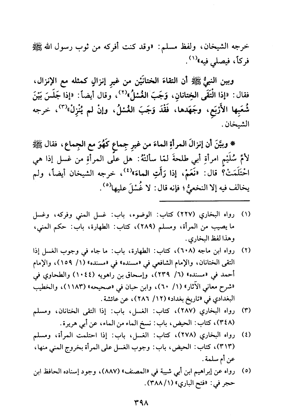 (¬3) رواه البخاري (287)، كتاب: الغسل، باب: إذا التقى الختانان، ومسلم (348)، كتاب: الحيض، باب: نسخ الماء من الماء، عن أبي هريرة.