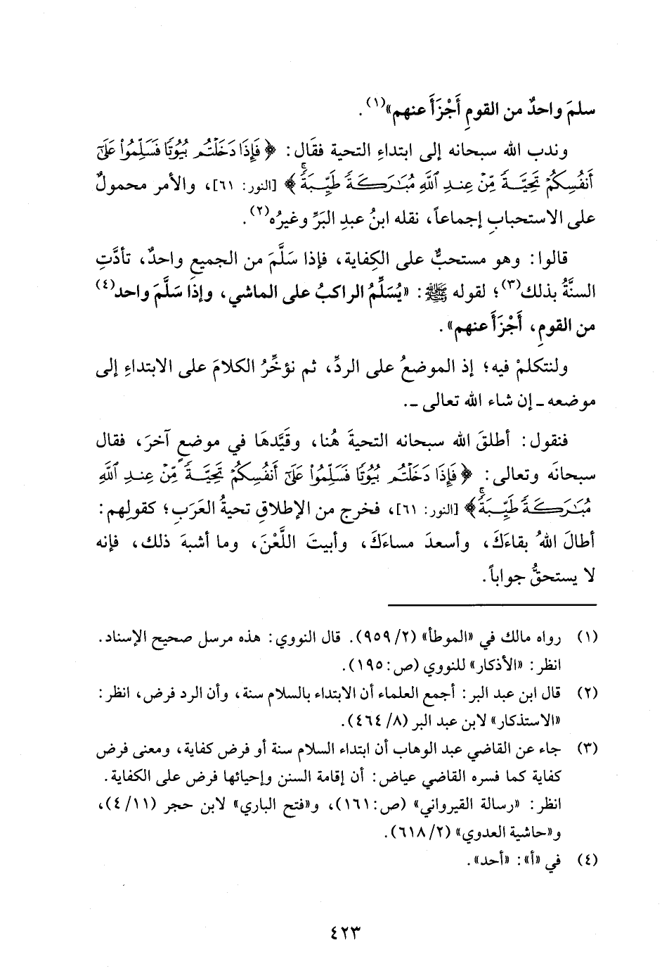 (¬3) جاء عن القاضي عبد الوهاب أن ابتداء السلام سنة أو فرض كفاية، ومعنى فرض كفاية كما فسره القاضي عياض: أن إقامة السنن وإحيائها فرض على الكفاية. انظر: "رسالة القيرواني" (ص: 161)، و"فتح الباري" لابن حجر (11/ 4)، و"حاشية العدوي" (2/ 618).