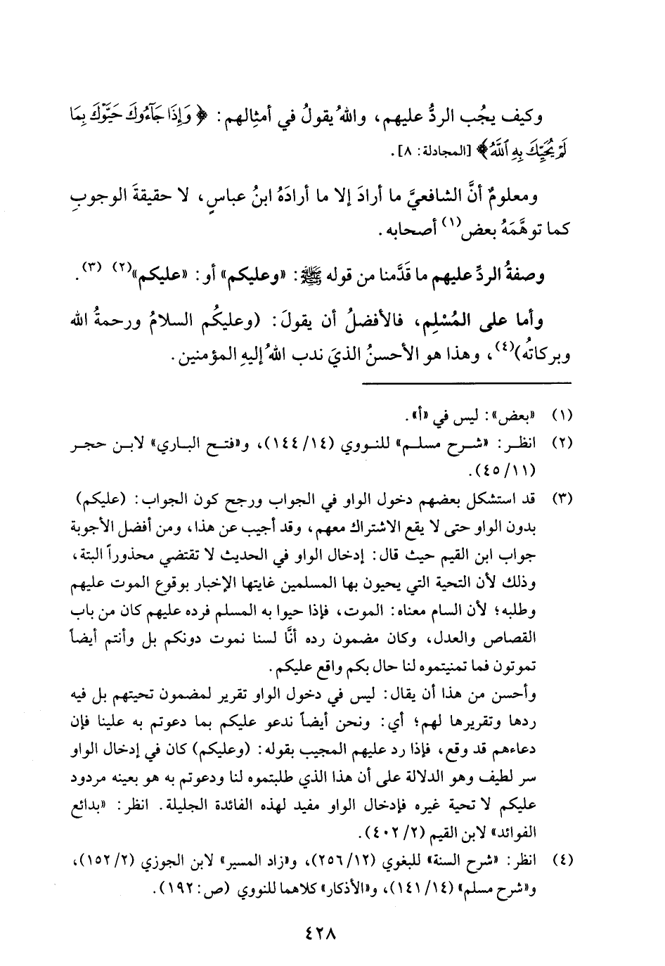 وأما على المُسْلِم، فالأفضلُ أن يقولَ: (وعليكُم السلامُ ورحمةُ الله وبركاتُه) (¬4)، وهذا هو الأحسنُ الذيَ ندب اللهُ إليهِ المؤمنين.