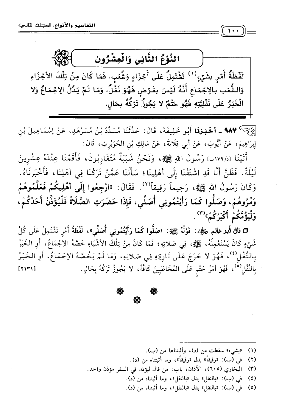 ٩٨٧ - أَخبَرنا أَبُو خَلِيفَةَ، قَالَ: حَدثنا مُسَدَّدُ بْنُ مُسَرْهَدٍ، عَنْ إِسْمَاعِيلَ بْنِ إِبْرَاهِيمَ، عَنْ أَيُّوبَ، عَنْ أَبِي قِلَابَةَ، عَنْ مَالِكِ بْنِ الْحُوَيْرِثِ، قَالَ: أَتَيْنَا رَسُولَ اللهِ صَلى الله عَلَيه وسَلم وَنَحْنُ شَبَبَةٌ مُتَقَارِبُونَ، فَأَقَمْنَا عِنْدَهُ عِشْرِينَ لَيْلَةً، فَظَنَّ أَنَّا قَدِ اشْتَقْنَا إِلَى أَهْلِينَا، سَأَلَنَا عَمَّنْ تَرَكْنَا فِي أَهْلِنَا، فَأَخْبَرْنَاهُ، وَكَانَ رَسُولُ اللهِ صَلى الله عَلَيه وسَلم رَحِيمًا رَقِيقًا، فَقَالَ: "ارْجِعُوا إِلَى أَهْلِيكُمْ فَعَلِّمُوهُمْ، وَمُرُوهُمْ، وَصَلُّوا كَمَا رَأَيْتُمُونِي أُصَلِّي، فَإِذَا حَضَرَتِ الصَّلَاةُ فَلْيُؤَذِّنْ أَحَدُكُمْ، وَلْيَؤُمَّكُمْ أَكْبَرُكُمْ".