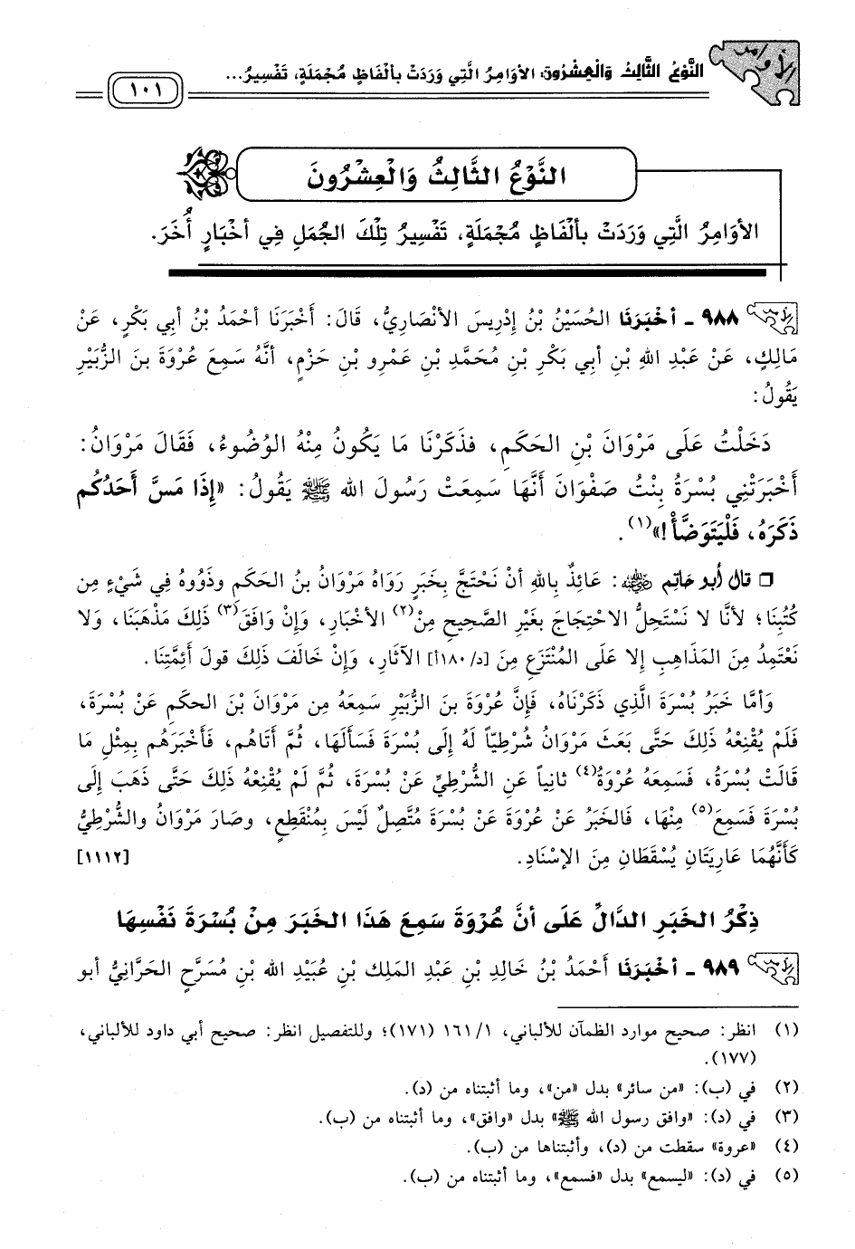 ٩٨٨ - أَخبَرنا الْحُسَيْنُ بْنُ إِدْرِيسَ الأَنْصَارِيُّ، قَالَ: أَخبَرنا أَحْمَدُ بْنُ أَبِي بَكْرٍ، عَنْ مَالِكٍ، عَنْ عَبْدِ اللهِ بْنِ أَبِي بَكْرِ بْنِ مُحَمَّدِ بْنِ عَمْرِو بْنِ حَزْمٍ، أَنَّهُ سَمِعَ عُرْوَةَ بْنَ الزُّبَيْرِ، يَقُولُ: دَخَلْتُ عَلَى مَرْوَانَ بْنِ الْحَكَمِ فَذَكَرْنَا مَا يَكُونُ مِنْهُ الْوُضُوءُ، فَقَالَ مَرْوَانُ: أَخْبَرَتْنِي بُسْرَةُ بِنْتُ صَفْوَانَ، أَنَّهَا سَمِعَتْ رَسُولَ اللهِ صَلى الله عَلَيه وسَلم، يَقُولُ: "إِذَا مَسَّ أَحَدُكُمْ ذَكَرَهُ، فَلْيَتَوَضَّأْ".