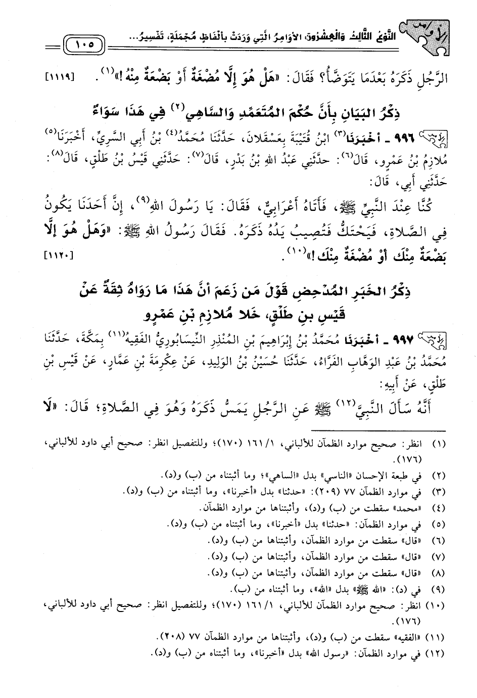 ٩٩٦ - أَخبَرنا ابْنُ قُتَيْبَةَ بِعَسْقَلَانَ، حَدثنا محمد بْنُ أَبِي السَّرِيِّ، أَخبَرنا مُلَازِمُ بْنُ عَمْرٍو، قَالَ: حَدَّثَنِي عَبْدُ اللهِ بْنُ بَدْرٍ، قَالَ: حَدَّثَنِي قَيْسُ بْنُ طَلْقٍ، قَالَ: حَدَّثَنِي أَبِي، قَالَ: كُنَّا عِنْدَ النَّبِيِّ صَلى الله عَلَيه وسَلم، فَأَتَاهُ أَعْرَابِيٌّ، فَقَالَ: يَا رَسُولَ اللهِ، إِنَّ أَحَدَنَا يَكُونُ فِي الصَّلَاةِ فَيَحْتَكُّ فَتُصِيبُ يَدُهُ ذَكَرَهُ، فَقَالَ رَسُولُ اللهِ صَلى الله عَلَيه وسَلم: "وَهَلْ هُوَ إِلَاّ بَضْعَةٌ مِنْكَ، أَوْ مُضْغَةٌ مِنْكَ". [١١٢٠]