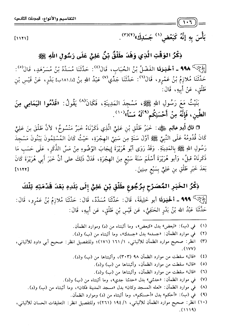 ٩٩٩ - أَخبَرنا أَبُو خَلِيفَةَ، قَالَ: حَدثنا مُسَدَّدٌ، قَالَ: حَدثنا مُلَازِمُ بْنُ عَمْرٍو، قَالَ: حَدثنا عَبْدُ اللهِ بْنُ بَدْرٍ الْحَنَفِيُّ، عَنْ قَيْسِ بْنِ طَلْقٍ، عَنْ أَبِيهِ، قَالَ: خَرَجْنَا سِتَّةً وَفْدًا إِلَى رَسُولِ اللهِ صَلى الله عَلَيه وسَلم، خَمْسَةٌ مِنْ بَنِي حَنِيفَةَ وَرَجُلٌ مِنْ بَنِي ضُبَيْعَةَ بْنِ رَبِيعَةَ، حَتَّى قَدِمْنَا عَلَى نَبِيِّ اللهِ صَلى الله عَلَيه وسَلم، فَبَايَعْنَاهُ وَصَلَّيْنَا مَعَهُ، وَأَخْبَرْنَاهُ أَنَّ بِأَرْضِنَا بَيْعَةً لَنَا، وَاسْتَوْهَبْنَاهُ مِنْ فَضْلِ طُهُورِهِ، فَدَعَا بِمَاءٍ فَتَوَضَّأَ مِنْهُ وَتَمَضْمَضَ، وَصَبَّ لَنَا فِي إِدَاوَةٍ، ثُمَّ قَالَ: "اذْهَبُوا بِهَذَا الْمَاءِ، فَإِذَا قَدِمْتُمْ بَلَدَكُمْ، فَاكْسِرُوا بِيعَتَكُمْ، ثُمَّ انْضَحُوا مَكَانَهَا مِنْ هَذَا الْمَاءِ، وَاتَّخِذُوا مَكَانَهَا مَسْجِدًا". فَقُلْنَا: يَا رَسُولَ اللهِ، الْبَلَدُ بَعِيدٌ، وَالْمَاءُ يَنْشَفُ، قَالَ: "فَأَمِدُّوهُ مِنَ الْمَاءِ، فَإِنَّهُ لَا يَزِيدُهُ إِلَاّ طِيبًا".