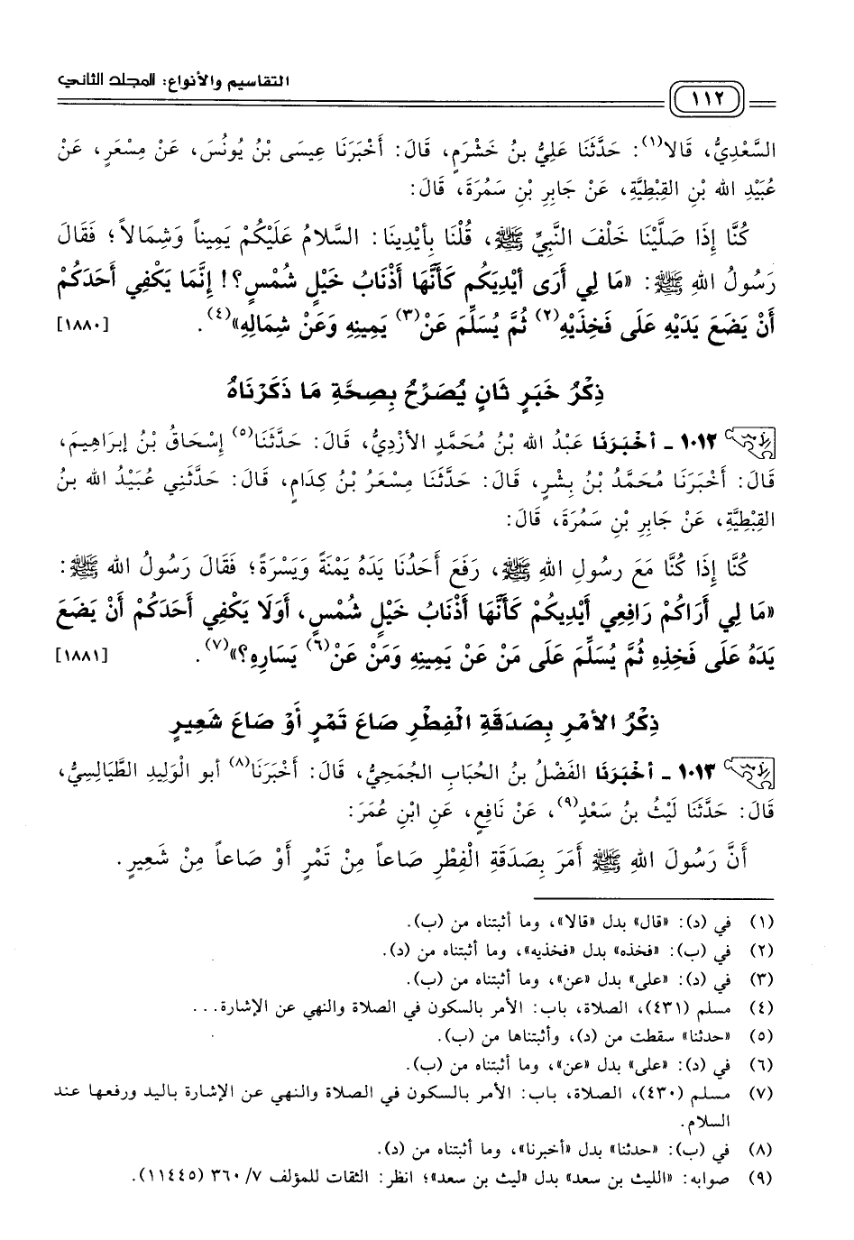 ١٠١٢ - أَخبَرنا عَبْدُ اللهِ بْنُ مُحَمَّدٍ الأَزْدِيُّ، قَالَ: حَدثنا إِسْحَاقُ بْنُ إِبْرَاهِيمَ، قَالَ: أَخبَرنا مُحَمَّدُ بْنُ بِشْرٍ، قَالَ: حَدثنا مِسْعَرُ بْنُ كِدَامٍ، قَالَ: حَدَّثَنِي عُبَيْدُ اللهِ بْنُ الْقِبْطِيَّةِ، عَنْ جَابِرِ بْنِ سَمُرَةَ، قَالَ: كُنَّا إِذَا كُنَّا مَعَ رَسُولِ اللهِ صَلى الله عَلَيه وسَلم، رَفَعَ أَحَدُنَا يَدَهُ يَمْنَةً وَيَسْرَةً، فَقَالَ رَسُولُ اللهِ صَلى الله عَلَيه وسَلم: "مَا لِي أَرَاكُمْ رَافِعِي أَيْدِيكُمْ كَأَنَّهَا أَذْنَابُ خَيْلٍ شُمْسٍ، أَوَلَا يَكْفِي أَحَدَكُمْ أَنْ يَضَعَ يَدَهُ عَلَى فَخِذِهِ، ثُمَّ يُسَلِّمُ عَلَى مَنْ عَنْ يَمِينِهِ، وَمَنْ عَنْ يَسَارِهِ". [١٨٨١]