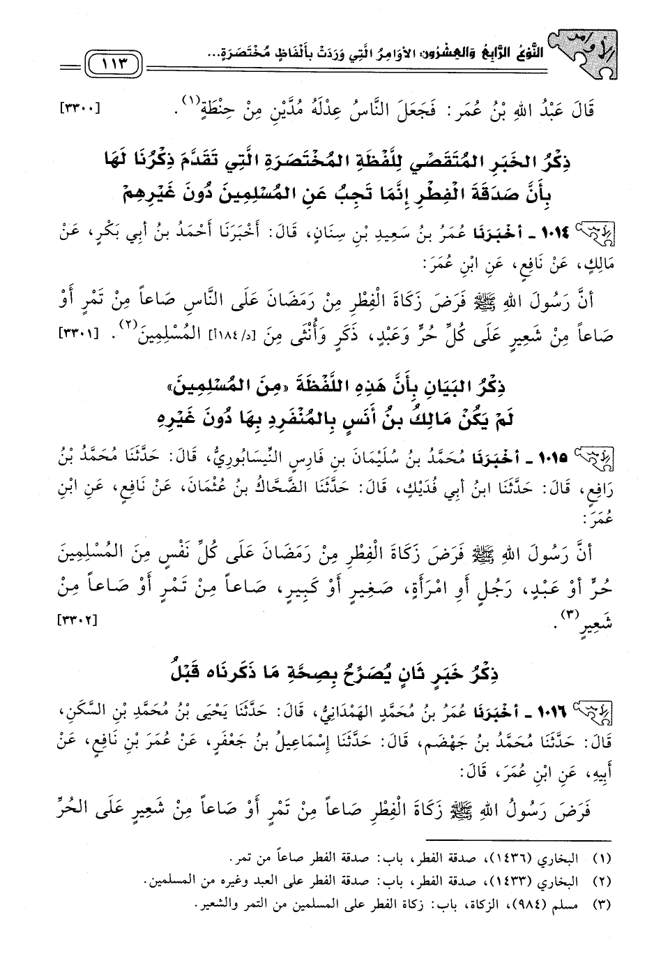 ١٠١٤ - أَخبَرنا عُمَرُ بْنُ سَعِيدِ بْنِ سِنَانٍ، قَالَ: أَخبَرنا أَحْمَدُ بْنُ أَبِي بَكْرٍ، عَنْ مَالِكٍ، عَنْ نَافِعٍ، عَنِ ابْنِ عُمَرَ؛ أَنَّ رَسُولَ اللهِ صَلى الله عَلَيه وسَلم فَرَضَ زَكَاةَ الْفِطْرِ مِنْ رَمَضَانَ عَلَى النَّاسِ صَاعًا مِنْ تَمْرٍ، أَوْ صَاعًا مِنْ شَعِيرٍ، عَلَى كُلِّ حُرٍّ وَعَبْدٍ، ذَكَرٍ وَأُنْثَى مِنَ الْمُسْلِمِينَ. [٣٣٠١]
