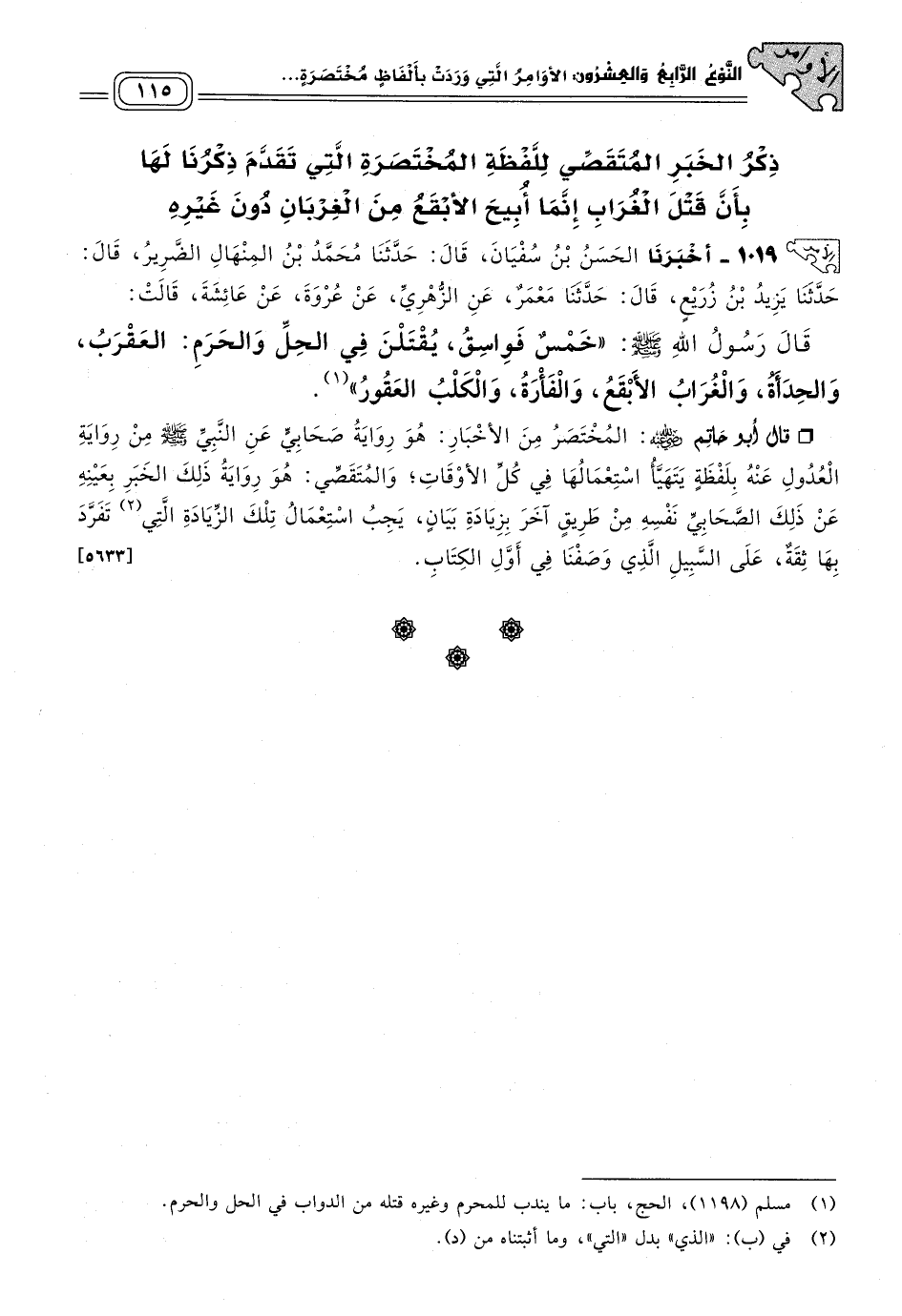 قَالَ أَبُو حَاتِمٍ رَضِيَ اللهُ عَنْهُ: الْمُخْتَصَرُ مِنَ الأَخْبَارِ هُوَ رِوَايَةُ صَحَابِيٍّ عَنِ النَّبِيِّ صَلى الله عَلَيه وسَلم مِنْ رِوَايَةِ الْعُدُولِ عَنْهُ بِلَفْظَةٍ يَتَهَيَّأُ اسْتِعْمَالُهَا فِي كُلِّ الأَوْقَاتِ، وَالْمُتَقَصِّي هُوَ رِوَايَةُ ذَلِكَ الْخَبَرِ بِعَيْنِهِ، عَنْ ذَلِكَ الصَّحَابِيِّ نَفْسِهِ مِنْ طَرِيقٍ آخَرَ بِزِيَادَةِ بَيَانٍ، يَجِبُ اسْتِعْمَالُ تِلْكَ الزِّيَادَةِ الَّتِي تَفَرَّدَ بِهَا ثِقَةٌ عَلَى السَّبِيلِ الَّذِي وَصَفْنَا فِي أَوَّلِ الْكِتَابِ. [٥٦٣٣]