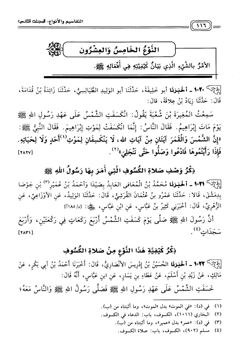 ١٠٢١ - أَخبَرنا مُحَمَّدُ بْنُ الْمُعَافَى الْعَابِدُ بِصَيدَا، وَأَحْمَدُ بْنُ عُمَيْرِ بْنِ جَوْصَا، بِدِمَشْقَ، قَالَا: حَدثنا عَمْرُو بْنُ عُثْمَانَ الْقُرَشِيُّ، قَالَ: حَدثنا الْوَلِيدُ، عَنِ الأَوْزَاعِيِّ، عَنِ الزُّهْرِيِّ، قَالَ: أَخْبَرَنِي كَثِيرُ بْنُ عَبَّاسٍ، عَنِ ابْنِ عَبَّاسٍ رَضِيَ اللهُ عَنْهُما، أَنَّ رَسُولَ اللهِ صَلى الله عَلَيه وسَلم، صَلَّى يَوْمَ كَسَفَتِ الشَّمْسُ أَرْبَعَ رَكَعَاتٍ فِي رَكْعَتَيْنِ، وَأَرْبَعَ سَجَدَاتٍ. [٢٨٣١]