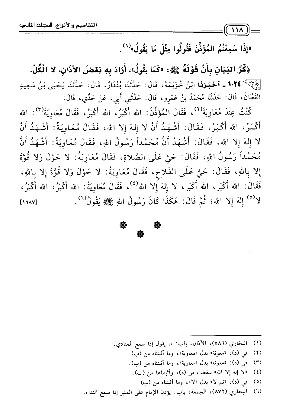 ١٠٢٤ - أَخبَرنا ابْنُ خُزَيْمَةَ، قَالَ: حَدثنا بُنْدَارٌ، قَالَ: حَدثنا يَحْيَى بْنُ سَعِيدٍ الْقَطَّانُ، قَالَ: حَدثنا مُحَمَّدُ بْنُ عَمْرٍو، قَالَ: حَدَّثَنِي أَبِي، عَنْ جَدِّي، قَالَ: كُنْتُ عِنْدَ مُعَاوِيَةَ، فَقَالَ الْمُؤَذِّنُ: اللهُ أَكْبَرُ، اللهُ أَكْبَرُ، فَقَالَ مُعَاوِيَةُ: اللهُ أَكْبَرُ، اللهُ أَكْبَرُ، فَقَالَ: أَشْهَدُ أَنْ لَا إِلَهَ إِلَاّ اللهُ، فَقَالَ مُعَاوِيَةُ: أَشْهَدُ أَنْ لَا إِلَهَ إِلَاّ اللهُ، فَقَالَ: أَشْهَدُ أَنَّ مُحَمَّدًا رَسُولُ اللهِ، فَقَالَ مُعَاوِيَةُ: أَشْهَدُ أَنَّ مُحَمَّدًا رَسُولُ اللهِ، فَقَالَ: حَيَّ عَلَى الصَّلَاةِ، فَقَالَ مُعَاوِيَةُ: لَا حَوْلَ وَلَا قُوَّةَ إِلَاّ بِاللهِ، فَقَالَ: حَيَّ عَلَى الْفَلَاحِ، فَقَالَ مُعَاوِيَةُ: لَا حَوْلَ وَلَا قُوَّةَ إِلَاّ بِاللهِ، فَقَالَ: اللهُ أَكْبَرُ، اللهُ أَكْبَرُ، لَا إِلَهَ إِلَاّ اللهُ، فَقَالَ مُعَاوِيَةُ: اللهُ أَكْبَرُ، اللهُ أَكْبَرُ، لَا إِلَهَ إِلَاّ اللهُ، ثُمَّ قَالَ: هَكَذَا كَانَ رَسُولُ اللهِ صَلى الله عَلَيه وسَلم يَقُولُ. [١٦٨٧]