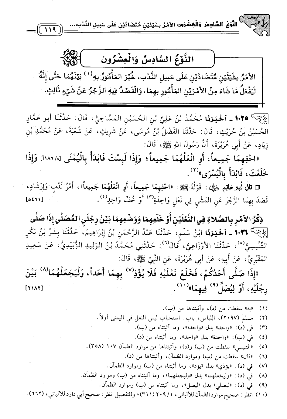 ١٠٢٥ - أَخبَرنا مُحَمَّدُ بْنُ عَلِيِّ بْنِ الْحُسَيْنِ الْمَسَّاحِيُّ، قَالَ: حَدثنا أَبُو عَمَّارٍ الْحُسَيْنُ بْنُ حُرَيْثٍ، قَالَ: حَدثنا الْفَضْلُ بْنُ مُوسَى، عَنْ شَرِيكٍ، عَنْ شُعْبَةَ، عَنْ مُحَمَّدِ بْنِ زِيَادٍ، عَنْ أَبِي هُرَيْرَةَ، أَنَّ رَسُولَ اللهِ صَلى الله عَلَيه وسَلم قَالَ: "احْفِهِمَا جَمِيعًا أَوِ انْعَلْهُمَا جَمِيعًا، وَإِذَا لَبِسْتَ فَابْدَأْ بِالْيُمْنَى، وَإِذَا خَلَعْتَ فَابْدَأْ بِالْيُسْرَى".
