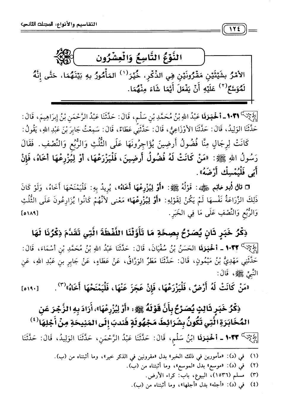 ١٠٣٣ - أَخبَرنا ابْنُ سَلْمٍ، قَالَ: حَدثنا عَبْدُ الرَّحْمَنِ، حَدثنا الْوَلِيدُ، قَالَ: حَدثنا الأَوْزَاعِيُّ، قَالَ: حَدَّثَنِي أَبُو النَّجَاشِيِّ، أَنَّهُ سَمِعَ رَافِعَ بْنَ خَدِيجٍ، يُحَدِّثُ عَنْ عَمِّهِ ظُهَيْرِ بْنِ رَافِعٍ، قَالَ: نَهَانَا رَسُولُ اللهِ صَلى الله عَلَيه وسَلم عَنْ أَمْرٍ كَانَ لَنَا مُوَافِقًا، فَقُلْتُ: مَا قَالَ رَسُولُ اللهِ صَلى الله عَلَيه وسَلم فَهُوَ حَقٌّ، فَقَالَ: قَالَ رَسُولُ اللهِ صَلى الله عَلَيه وسَلم: "مَا تَصْنَعُونَ بِمَحَاقِلِكُمْ؟ " قُلْنَا: نُؤَاجِرُهَا عَلَى الثُّلُثِ، وَالرُّبُعِ، وَالأَوْسُقِ مِنَ الْبُرِّ، وَالشَّعِيرِ، قَالَ: "فَلَا تَفْعَلُوا ازْرَعُوهَا، أَوْ أَزْرِعُوهَا".
