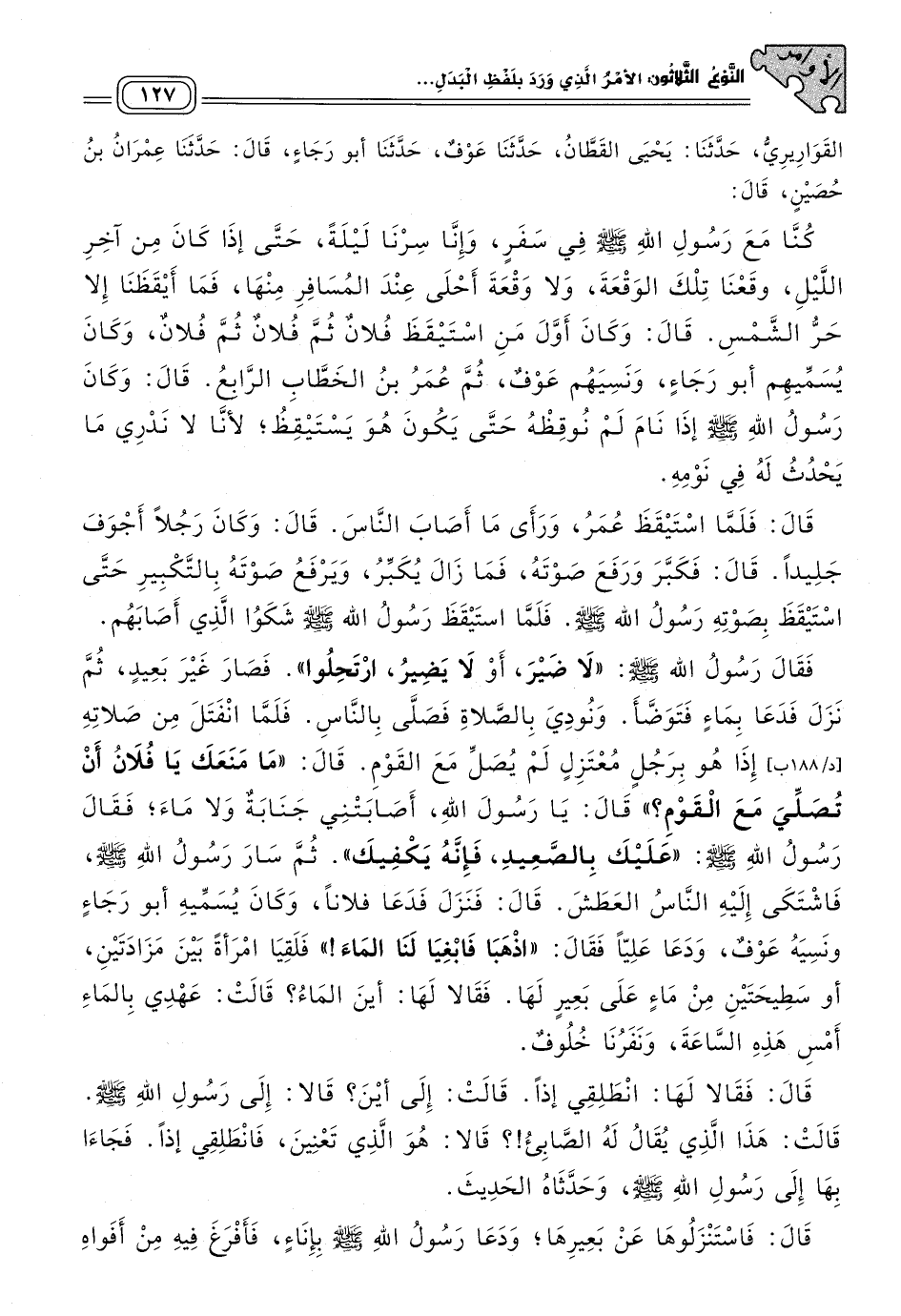 قَالَ: وَكَانَ رَسُولُ اللهِ صَلى الله عَلَيه وسَلم إِذَا نَامَ لَمْ نُوقِظْهُ حَتَّى يَكُونَ هُوَ يَسْتَيْقِظُ، لأَنَّا لَا نَدْرِي مَا يَحْدُثُ لَهُ فِي نَوْمِهِ. قَالَ: فَلَمَّا اسْتَيْقَظَ عُمَرُ وَرَأَى مَا أَصَابَ النَّاسَ، قَالَ: وَكَانَ رَجُلاً أَجْوَفَ جَلِيدًا، قَالَ: فَكَبَّرَ وَرَفَعَ صَوْتَهُ، فَمَا زَالَ يُكَبِّرُ وَيَرْفَعُ صَوْتَهُ بِالتَّكْبِيرِ حَتَّى اسْتَيْقَظَ بِصَوْتِهِ رَسُولُ اللهِ صَلى الله عَلَيه وسَلم، فَلَمَّا اسْتَيْقَظَ رَسُولُ اللهِ صَلى الله عَلَيه وسَلم، شَكَوُا الَّذِي أَصَابَهُمْ، فَقَالَ رَسُولُ اللهِ صَلى الله عَلَيه وسَلم: "لَا ضَيْرَ، أَوْ لَا يَضِيرُ، ارْتَحِلُوا". فَصَارَ غَيْرَ بَعِيدٍ، ثُمَّ نَزَلَ فَدَعَا بِمَاءٍ فَتَوَضَّأَ، وَنُودِيَ بِالصَّلَاةِ، فَصَلَّى بِالنَّاسِ، فَلَمَّا انْفَتَلَ مِنْ صَلَاتِهِ، إِذَا هُوَ بِرَجُلٍ مُعْتَزِلٍ لَمْ يُصَلِّ مَعَ الْقَوْمِ.