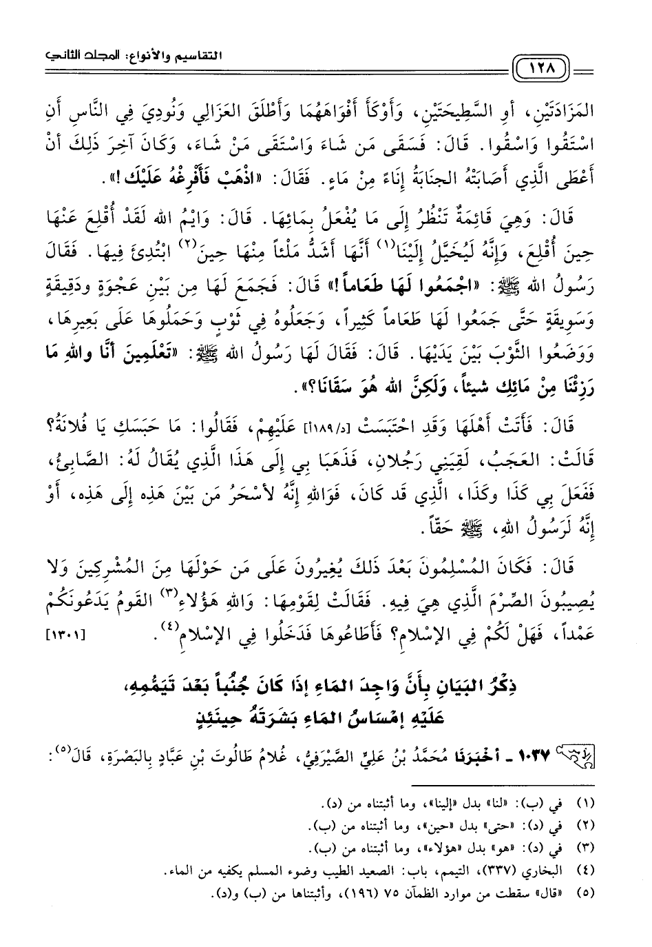١٠٣٧ - أَخبَرنا مُحَمَّدُ بْنُ عَلِيٍّ الصَّيْرَفِيُّ، غُلَامُ طَالُوتَ بْنِ عَبَّادٍ، بِالْبَصْرَةِ، قَالَ: حَدثنا الْفُضَيْلُ بْنُ الْحُسَيْنِ الْجَحْدَرِيُّ، قَالَ: حَدثنا يَزِيدُ بْنُ زُرَيْعٍ، قَالَ: حَدثنا خَالِدٌ الْحَذَّاءُ، عَنْ أَبِي قِلَابَةَ، عَنْ عَمْرِو بْنِ بُجْدَانَ، قَالَ: سَمِعْتُ أَبَا ذَرٍّ، قَالَ: اجْتَمَعَتْ عِنْدَ رَسُولِ اللهِ صَلى الله عَلَيه وسَلم غَنَمٌ مِنْ غَنَمِ الصَّدَقَةِ، فَقَالَ: "ابْدُ يَا أَبَا ذَرٍّ"، قَالَ: فَبَدَوْتُ فِيهَا إِلَى الرَّبَذَةِ، قَالَ: فَكَانَ يَأْتِي عَلَيَّ الْخَمْسُ وَالسِّتُّ وَأَنَا جُنُبٌ، فَوَجَدْتُ فِي نَفْسِي، فَأَتَيْتُ النَّبِيَّ صَلى الله عَلَيه وسَلم وَهُوَ مُسْنِدٌ ظَهْرَهُ إِلَى الْحُجْرَةِ، فَلَمَّا رَآنِي، قَالَ: "مَا لَكَ يَا أَبَا ذَرٍّ؟ " قَالَ: فَجَلَسْتُ، قَالَ: "مَا لَكَ يَا أَبَا ذَرٍّ، ثَكِلَتْكَ أُمُّكَ؟ " قُلْتُ: يَا رَسُولَ اللهِ، جُنُبٌ. قَالَ: فَأَمَرَ جَارِيَةً سَوْدَاءَ، فَجَاءَتْ بِعُسٍّ فِيهِ مَاءٌ، فَاسْتَتَرْتُ بِالْبَعِيرِ وَبِالثَّوْبِ، فَاغْتَسَلْتُ، قال: فَكَأَنَّمَا وَضَعَ عَنِّي جَبَلاً، فَقَالَ: "ادْنُ فَإِنَّ الصَّعِيدَ الطَّيِّبَ وَضُوءُ الْمُسْلِمِ وَلَوْ عَشْرَ حِجَجٍ، فَإِذَا وَجَدَ الْمَاءَ فَلْيُمِسَّ بَشَرَتَهُ الْمَاءَ". [١٣١٢]
