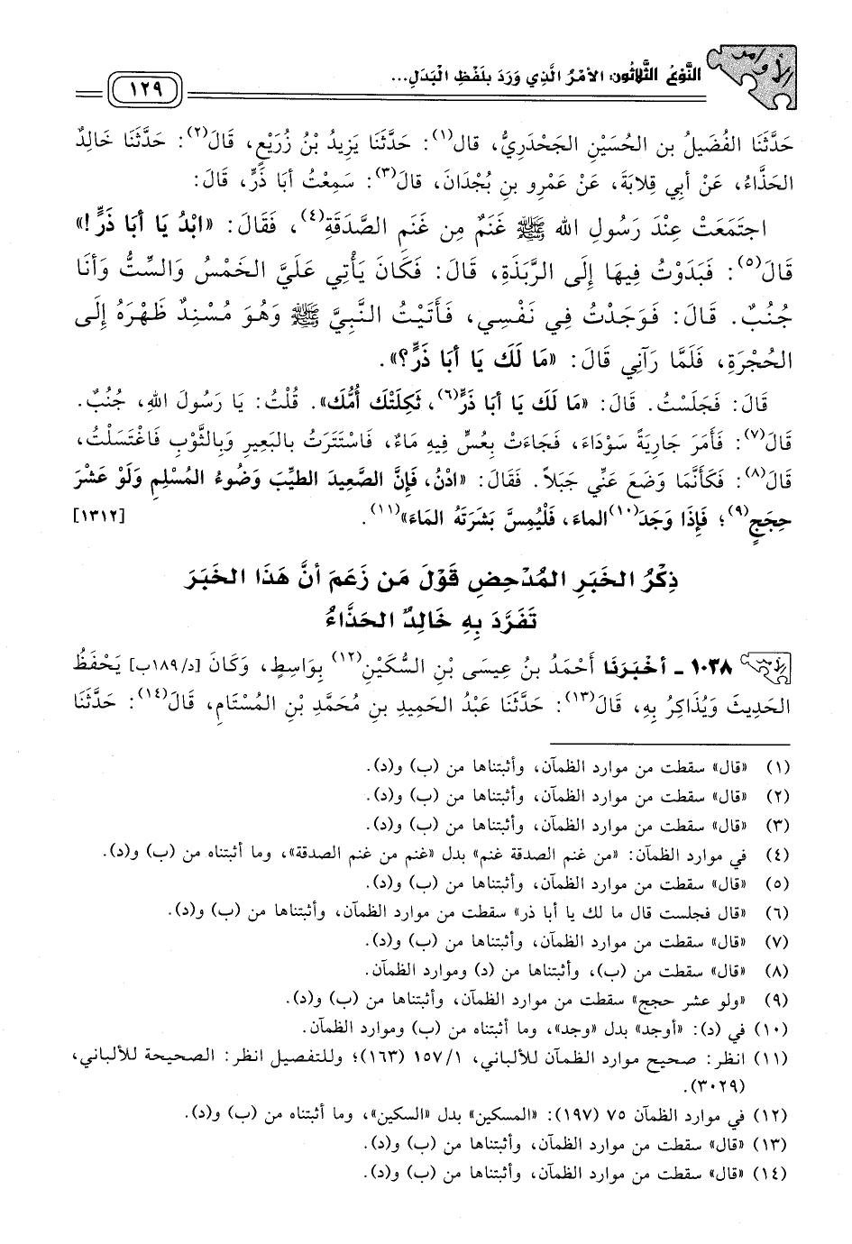 ١٠٣٨ - أَخبَرنا أَحْمَدُ بْنُ عِيسَى بْنِ السُّكينِ، بِوَاسِطَ، وَكَانَ يَحْفَظُ الْحَدِيثَ، وَيُذَاكِرُ بِهِ، قَالَ: حَدثنا عَبْدُ الْحَمِيدِ بْنُ مُحَمَّدِ بْنِ الْمُسْتَامِ، قَالَ: حَدثنا مَخْلَدُ بْنُ يَزِيدَ، قَالَ: حَدثنا سُفْيَانُ الثَّوْرِيُّ، عَنْ أَيُّوبَ السَّخْتِيَانِيِّ، وَخَالِدٍ الْحَذَّاءِ، عَنْ أَبِي قِلَابَةَ، عَنْ عَمْرِو بْنِ بُجْدَانَ، عَنْ أَبِي ذَرٍّ، قَالَ: قَالَ رَسُولُ اللهِ صَلى الله عَلَيه وسَلم: "الصَّعِيدُ الطَّيِّبُ وَضُوءُ الْمُسْلِمِ، وَإِنْ لَمْ يَجِدِ الْمَاءَ عَشْرَ سِنِينَ". [١٣١٣]